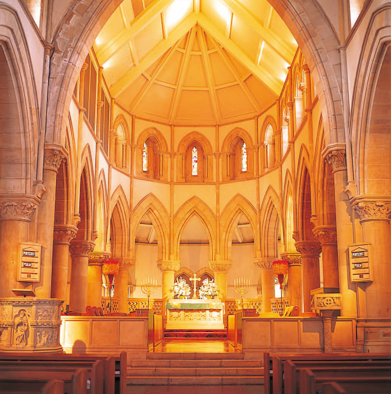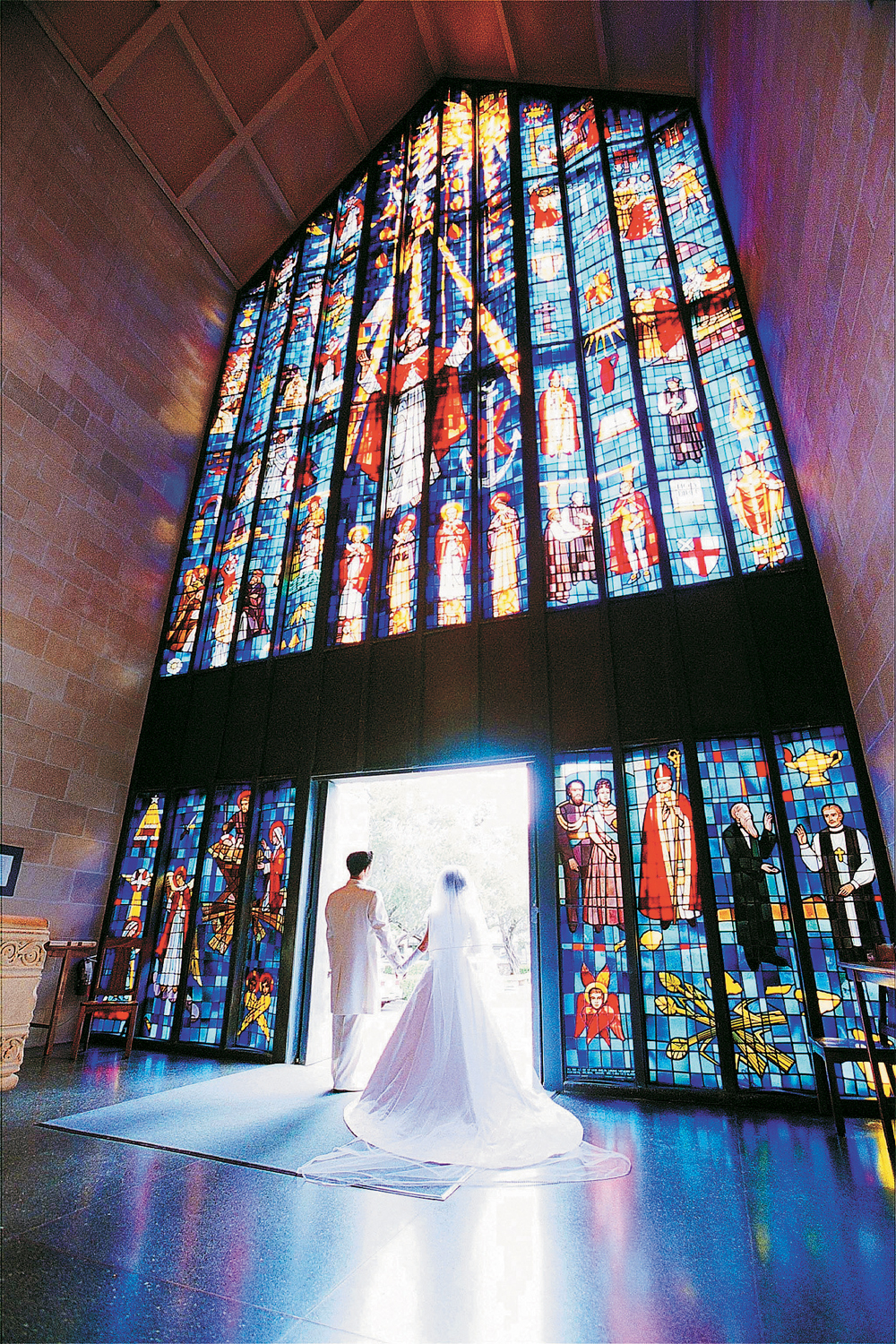 中世ヨーロッパの古城のような荘厳さがあり、天井まで届く幻想的なステンドグラスの光が非常に美しい教会。