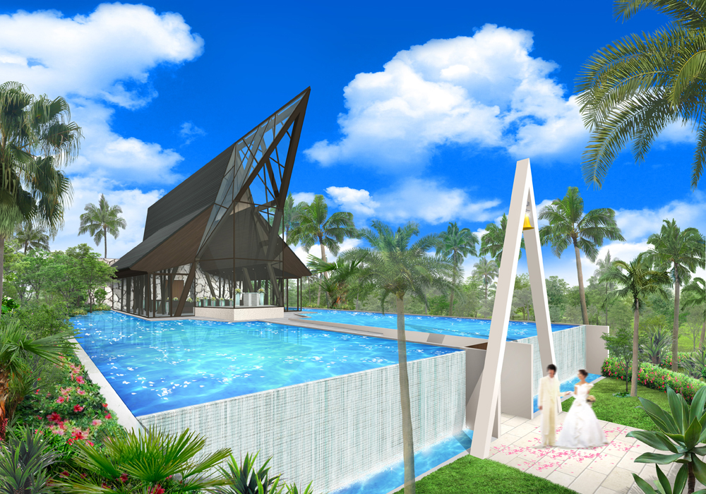 「ホヌカイラニ コオリナ・プレイス・オブ・ウェリナ」チャペル外観イメージ。チャペル前方に広がる水盤を通り抜け、セレモニーガーデン、パーティ会場へと結ぶことで、カップルに高いプライベート空間を提供。