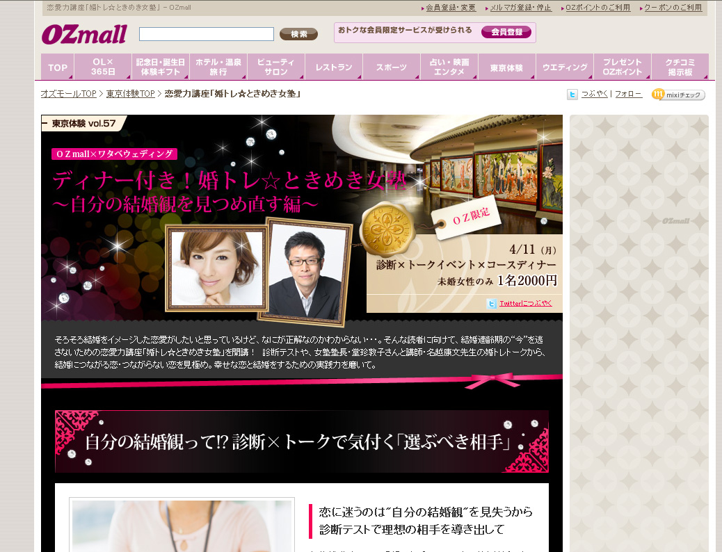 「オズモール」は首都圏女性情報誌「OZ magazine」のインターネット版。ウェディング会場や高級ホテル、レストラン、ヘアサロンなどの贅沢なプランがおトクに予約できたり、心理テストや占い、プレゼント企画など女性に役立つポータルサイト。