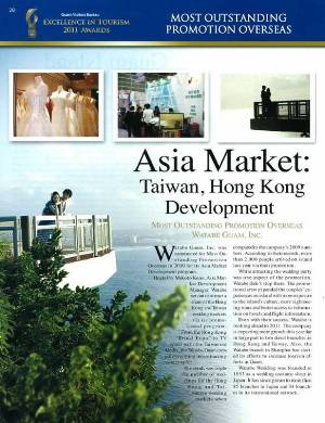 ワタベウェディング グアム店のアジアマーケット部門の受賞理由は『日本以外のアジア圏から年間約300組のカップルや2,000名もの列席者の記憶に残る感動を創造し、グアムウェディング市場を牽引して観光産業に貢献していること』が高く評価されたものです。香港、台湾、中国経由の2010年度のグアム取り扱いは約300組となり、前年比約5倍と高い伸びとなりました。今まさに、グアムはアジアのお客様にとって「人気リゾートウェディングの候補地」として定着してきています。また、6月18日には、エバー航空の台北/グアム線の定期便が就航する予定であり、グアムリゾートウェディングにとって大きな追い風となります。