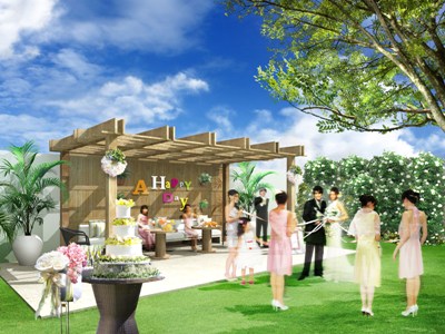 結婚式当日ゲストとゆったりお過ごしいただきたい、そんな思いから「Family Tree Garden」はつくられました。チャペルでの結婚式後にゲストとゆったりと過ごすことができる空間です。青空と青い海に囲まれたガーデンでは、それぞれ異なった背景でお写真を残すことができます。
