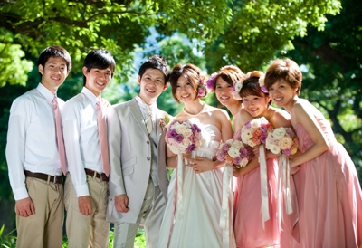 花嫁の友人の女性数名がブーケを持ち、ベールを直すなど、忙しい花嫁の身の回りのお手伝いなどの役割を担います。お揃いまたは同色のドレスを着てブーケを持ち、結婚式に華を添え引き立てます。