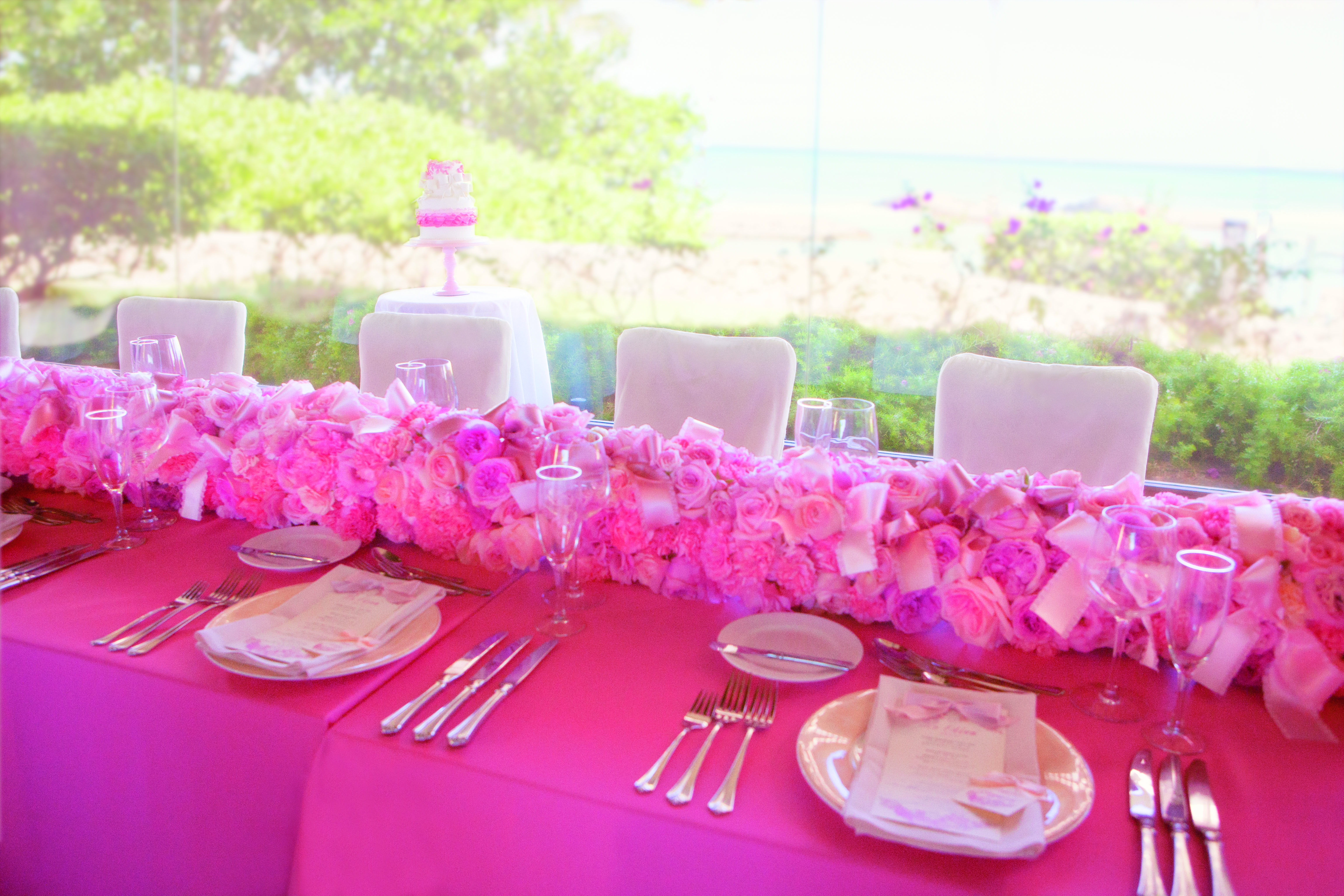 ドリーミーな空間と開放的なビーチを同時によくばれる宝物のような時間をローズとリボンのデコレーション、ピンクのテーブルクロス……。パーティールームももちろん、ふたりの幸せを祝うピンクでコーディネート。大きな窓からビーチを眺めながら、ゲストと過ごす幸せな時間は一生の想い出として、ずっとみんなの心に残っていくはず。おもてなしもハッピー感溢れるピンクのデコレーションで。