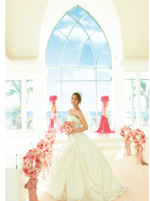 チャペルの扉を開くと、十字架の向こうにどこまでも続く空と水平線が目に飛び込んできます。ふわふわのフラワーバージンロードと幸せを運ぶローズリース。海とのコントラストが鮮やかなピンクデコレーションでハッピーオーラがふたりを甘やかに包んでいきます。全ての女性の憧れを凝縮したロマンティックな空間に、花嫁はもちろん、ゲストもうっとり。