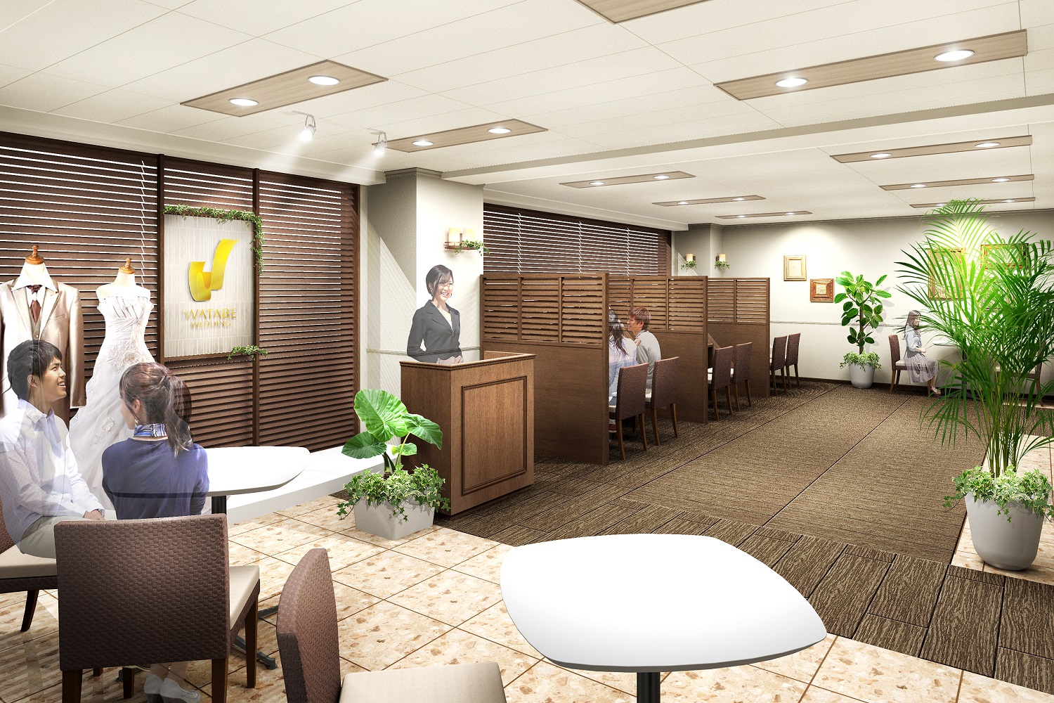 ワタベウェディングでは、高まるリゾートウェディングのニーズに応え、全国の多くのお客様にリゾートウェディングとワタベウェディングをより身近に感じていただけるよう、今年度より店舗の新規オープンやリニューアルを実施しております。店舗のコンセプトを「Traditional Resort Hotel」とし、ご来店のお客様に“リゾ婚”のイメージを膨らませていただくために、店内でリゾートを感じていただけるような空間づくりをしております。
