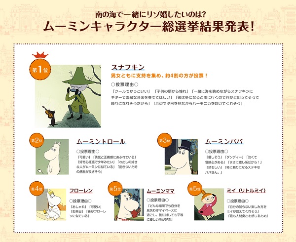 ワタベウェディング株式会社【本社:京都府京都市、資本金41億7,637万2,000円、東証第一部上場、代表取締役 花房伸晃】は、映画「劇場版ムーミン 南の海で楽しいバカンス」(2月13日より全国にて公開中)の公開を記念し、ムーミン一家が旅するリゾート地にちなんで、「南の海で一緒に“リゾ婚”(リゾートウェディング)をしたいムーミンに登場するキャラクター総選挙」を行いました(2015年2月12日~2月23日実施、有効回答数101名)。以下に結果をご報告いたします。