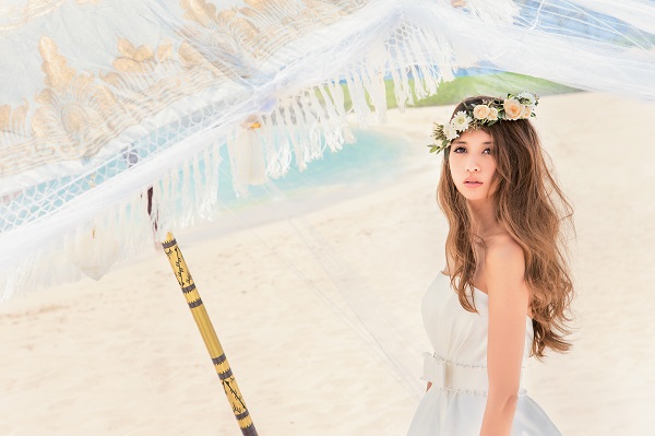 満ち足りた満月・星・金星、ヴィーナスという意味を持つhoku。繊細なジョーゼット素材のエンパイアラインをまとえば、まるで女神のようにエレガントな雰囲気。リボンのホルターネックが優雅に首周りを包み、よりしなやかに見えるブライズスタイルで誰からも愛される楽園のヒロインに。