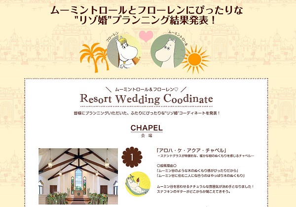 ワタベウェディング株式会社【本社:京都府京都市、資本金41億7,637万2,000円、東証第一部上場、代表取締役 花房伸晃】は、現在公開中の映画「劇場版ムーミン 南の海で楽しいバカンス」の公開を記念したコラボ企画として、特設Webサイト内で、ムーミントロールとそのガールフレンドであるフローレンにぴったりな“リゾ婚”をプランニングしていただくという企画を実施しました(2015年2月24日~3月12日実施、有効回答数100名)。以下に結果をご報告いたします。