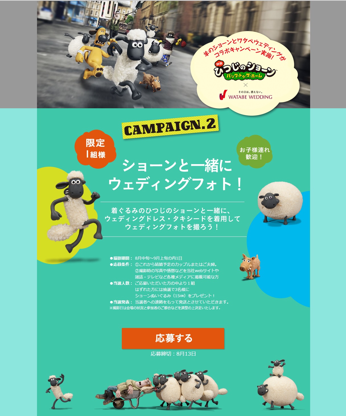 本キャンペーンは、今年がひつじ年ということにかけて、ウェディングドレスとタキシードでショーンの着ぐるみと一緒に撮影ができる限定企画です。参加カップルは、プロのヘアメイクとカメラマンによる本格的なウェディングフォトを体験いただけます。『ワタベウェディング』×『映画 ひつじのショーン~バック・トゥ・ザ・ホーム~』特設Webサイトの専用フォームよりご応募可能です。また、はずれた方の中から抽選で3名様にショーンのぬいぐるみ(大きさ:約15cm)をプレゼントいたします。