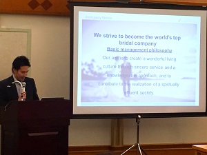 本講義では、当社人財戦略グループ長の佐藤賢が「マーケティング戦略とおもてなし」をテーマに講演いたしました。佐藤は「当社がいち早く取り入れた、観光地に挙式会場を設けるリゾート挙式のスタイルは、地域産業であったウェディングの常識を変え、日本中をターゲットにすることに成功した。また、当社としての「おもてなし」は、全世界にいるスタッフ全員が同一のクオリティの高いサービス力を持つことと考え、海外現地のスタッフに、当社独自の品質基準を満たす研修制度を設けている。」と話し、リゾートウェディングのパイオニアとしてのマーケティング戦略とホスピタリティ・サービスについて講演いたしました。