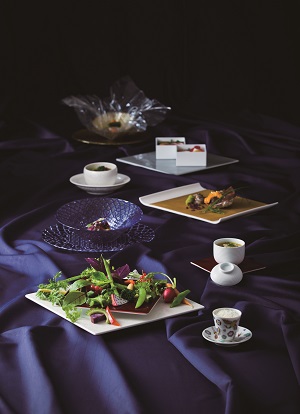 今回のリニューアルに伴い開発された新メニュー『琉球鳳凰』は、読谷の地形が幸運と幸せの旅立ちの地である東シナ海へ飛び立つ「鳳(おおとり)」の姿に似ていることから、その名が付けられました。山下春幸氏ならではの、沖縄料理と和食を融合させた、「おどろき」や「わくわく」の仕掛けがたくさん詰め込まれた“六感で感じる”新感覚のウェディングメニューです。沖縄野菜、沖縄名物「アグー豚」、沖縄のブランド和牛「本部牛」など、沖縄の厳選食材を用い「HAL YAMASHITA 東京」のエッセンスを全て注ぎ込んだ門出にふさわしい全8品のコース料理を提供します。なお、山下春幸氏とのコラボレーションによるウェディングメニューは、同じく「アクアグレイス・チャペル」限定で販売している『琉球黒松』に続き2作目となります。