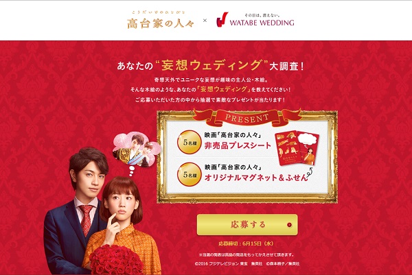 本キャンペーンでは、 妄想癖のあるヒロインにかけて、「あなたの妄想ウェディング」と題したアンケート調査を実施いたします。『ワタベウェディング』×映画『高台家の人々』特設Webサイトよりご応募いただいた方の中から、抽選で5名様に『高台家の人々』プレスシート、5名様にオリジナルマグネット&ふせんをプレゼントいたします。