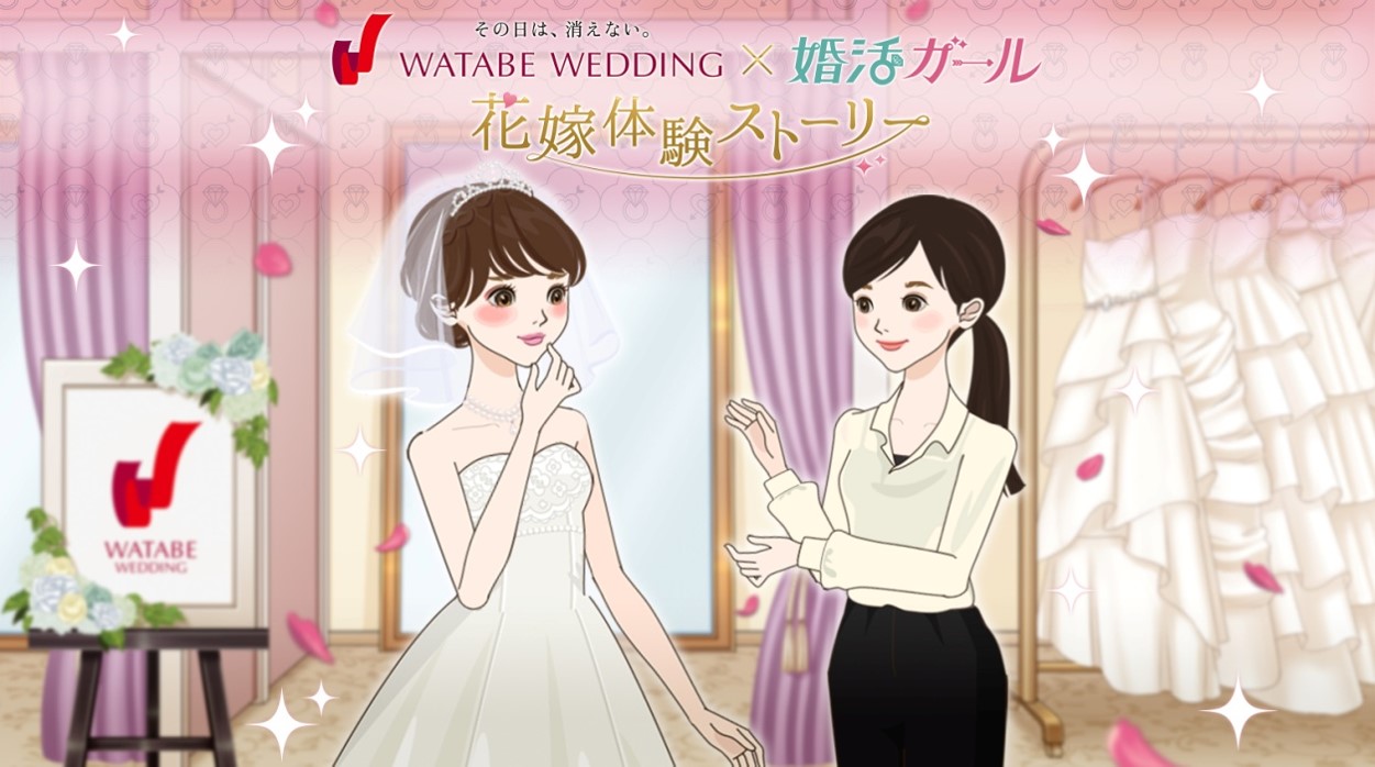 ワタベウェディング株式会社【本社:京都府京都市、資本金41億7,637万2,000円、東証第一部上場、代表取締役 花房伸晃】は、株式会社ボルテージ【本社:東京都渋谷区、代表取締役 津谷祐司】の戦略子会社 株式会社ボルモ【本社:東京都渋谷区、代表取締役 草亭大樹】が企画・開発するモーション型読み物アプリ「ワタシドラマ」内で配信中のタイトル『婚活ガール』とコラボレーションし、2017年8月25日(金)より、スペシャルシナリオ「WATABE WEDDING×婚活ガール 花嫁体験ストーリー」を配信開始します。当社がプロデュースするサイパンでのリゾートウェディングや、マリアナ政府観光局監修による、美しいマリアナの観光地を楽しめるオリジナルシミュレーションシナリオとなっています。