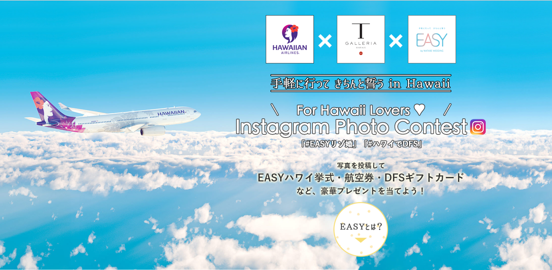 ワタベウェディング株式会社【本社:京都府京都市、代表取締役 花房伸晃】、ハワイアン航空【本社:ホノルル、代表取締役社長兼CEO マーク・ダンカリー(Mark Dunkerley)】、DFSグループ【東京都品川区、代表取締役 小川光永】は、ナシ婚花嫁応援企画第2弾として、「~手軽に行ってきちんと誓うin Hawaii~インスタグラムファミリーフォトコンテスト」を2017年9月1日(金)から合同で開催いたします。