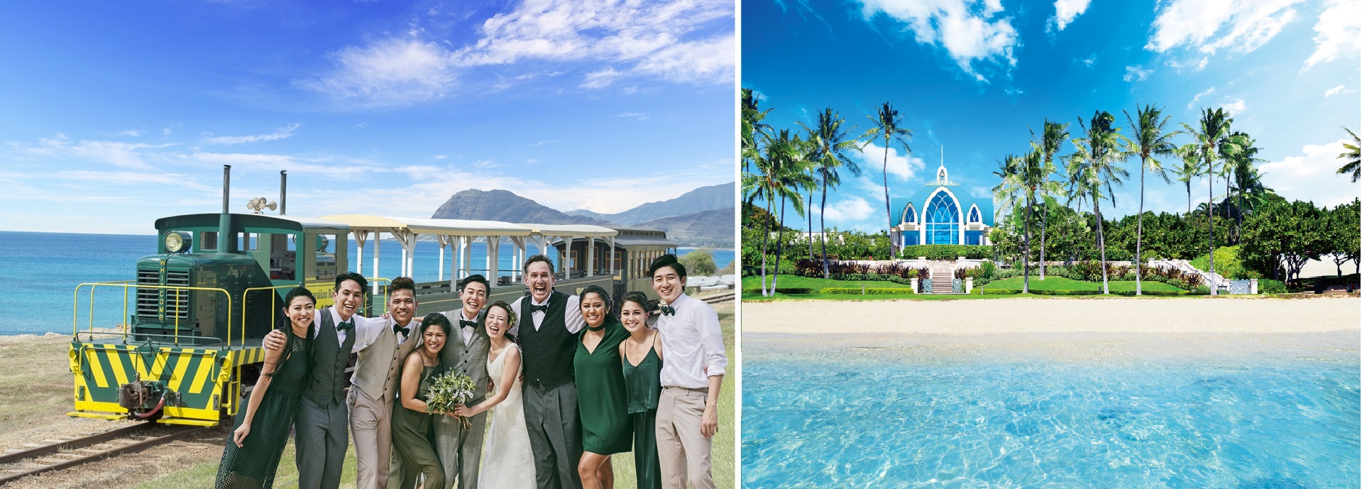 ハワイアントレインの貸し切り撮影や、ドローンを使ったムービー撮影、バラの花束の演出がセットになったサンセットビーチ撮影など、コオリナの美しいロケーションの中多くのメモリアルなシーンを残していただけます。