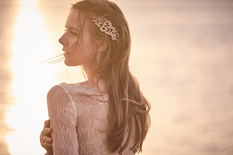 自由な発想から生まれたヘアジュエリー。カーブしたデザインでつけた位置に応じてフィットさせることができ、ティアラとしても、あるいはバレッタのようにサイドに留めても可憐。アンティークのレースをイメージした優雅さを漂わせる表情が、花嫁をいっそう美しく演出します。存在感のあるイヤリングをあわせると華やかな印象に。