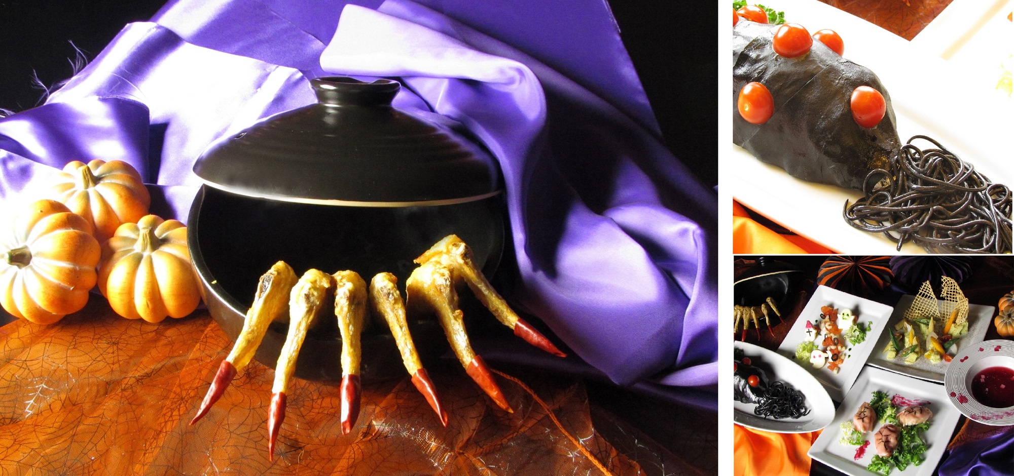 ※写真は3~4名分のイメージとなります。実際は、おひとり様のコース料理にて提供となる為、ホラー前菜の取り合わせは3種がワンプレートに、イカ墨パスタの蚕風は4分の1程度の大きさに、手羽先のディアブル~悪魔の指仕立て~は本数が3本になるなどの変更がございます。