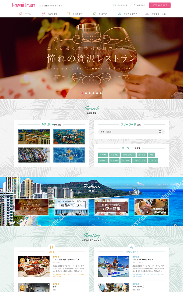 これまでハワイ旅専門ポータルサイト『Hawaii Lovers』では、ハワイの最新スポットや滞在中の過ごし方などの現地情報をはじめ、リゾートウェディングに関連する情報などを盛り込み、フリーマガジン『Hawaii Lovers For Resort Wedding』と連動した企画を展開してまいりました。リニューアル後は、よりラグジュアリーなトレンド情報を中心に集め、恋人や夫婦、家族など、“大切な人”と行きたくなるレストランやアクティビティなど各種サービスのコンテンツを充実させていきます。サイトデザインも一新し、アクセス数が多かったレストランやアクティビティをランキング形式で紹介するコーナーも新たに設けます。