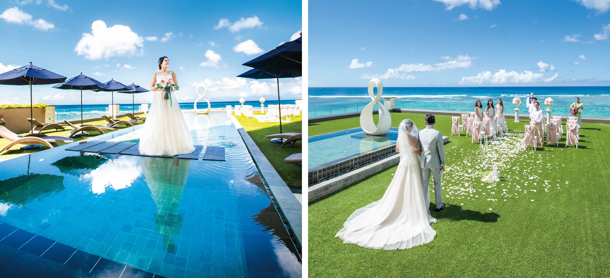 今回販売となる「デュシタニ ヴィラ アズール」は、ホテルには1室のみとなる洗練された高級ヴィラスイート「ヴィラ アズール -3ベッドルームオーシャンフロントヴィラ」での挙式とパーティのプランです。会場となるガーデンテラスからは、タモン湾の美しい海とパノラマビューを満喫することができます。当プランは、1日1組15時からの挙式限定となるため、プライベート感あふれるエレガントなヴィラウェディングが叶います。挙式後は、フィンガーフードとドリンクが楽しめる「カクテルパーティ」を行い、タモン湾の風を感じながらゲストとリラックスした時間を過ごすことができます。シェフが目の前で調理を行う「ガーデングリルパーティ」もおすすめです。さらにオプションで、上質なラグジュアリーホテルならではのロケーションの中、フォトジェニックな撮影を楽しむことができます。