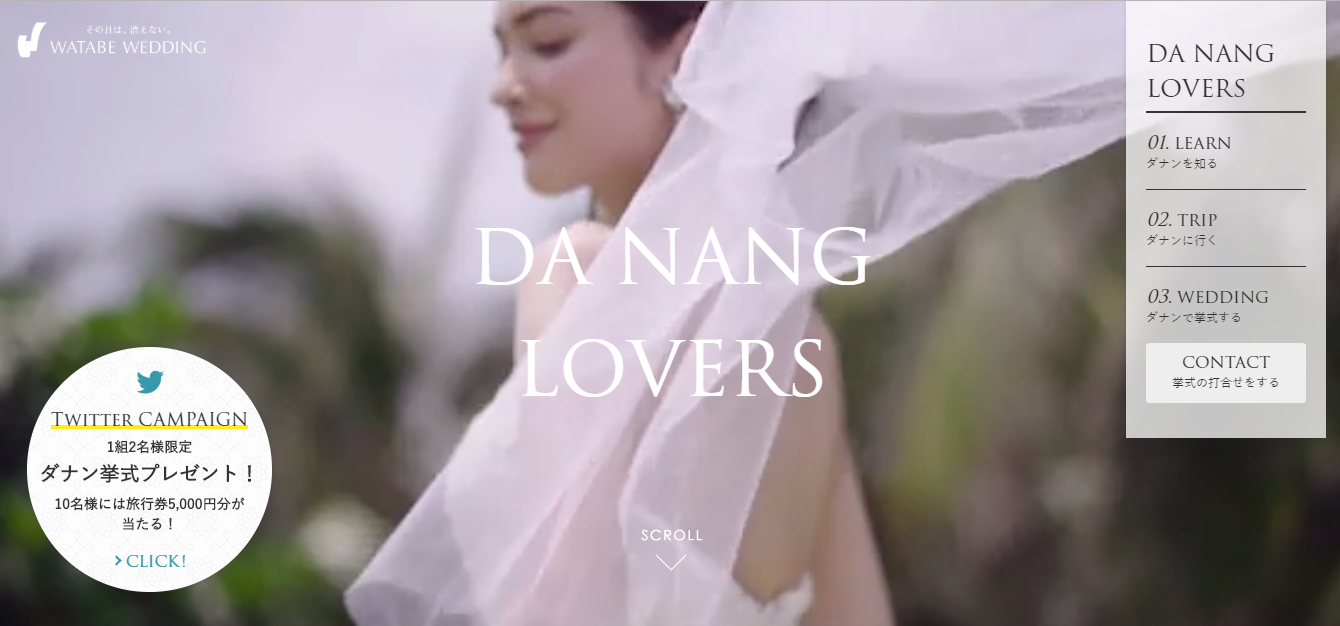 この度、「ワタベウェディング ダナン店」オープンを記念して、世界中で注目されているヴィラリゾートホテル「ナマン リトリート」でのビーチウェディング・ベトナム航空でいく日本-ダナン間の往復ビジネス航空券・「ナマン リトリート」宿泊2泊分を1組2名様へ、5000円分の旅行券を10名様へプレゼントするツイッターキャンペーンを実施いたします。プレゼント詳細やお申込み方法については、キャンペーン開始と同日オープンするダナン専門特設サイト「DA NANG LOVERS」(https://www.watabe-wedding.co.jp/press/dananglovers/)内キャンペーンページにてご確認いただけます。「DA NANG LOVERS」では、ダナンの魅力をより知っていただくべく、「ダナンを知る」「ダナンに行く」「ダナンで挙式をする」という3カテゴリーに分けて、ダナンの基本情報、観光情報、ウェディング会場などの魅力を紹介してまいります。