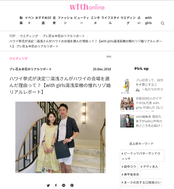 編集部と一緒に雑誌「with」やオフィシャルWEBサイト「with online」を盛り上げる読者組織「with girls」は、全国に3500人以上おり、湯浅菜穂さんは「with girls」の中でもトップクラスの人気を誇るメンバーです。2018年11月に、当社プロデュースによりハワイ「コオリナ・チャペル・プレイス・オブ・ジョイ」で挙式をされました。全6回に渡って公開されるレポートページ「with girls湯浅菜穂の憧れリゾ婚リアルレポート」は、挙式会場を選んだ理由、ウェディングドレス選びのポイント、結婚式当日のご様子、ハワイでのアフターウェディングの過ごし方などのテーマに分け、湯浅さんのリアルなコメントとたくさんの写真を用いて紹介いたします。with読者の中で憧れの存在である湯浅さんのリアルな挙式レポートは、プレ花嫁の皆様に役立つ情報が満載です。