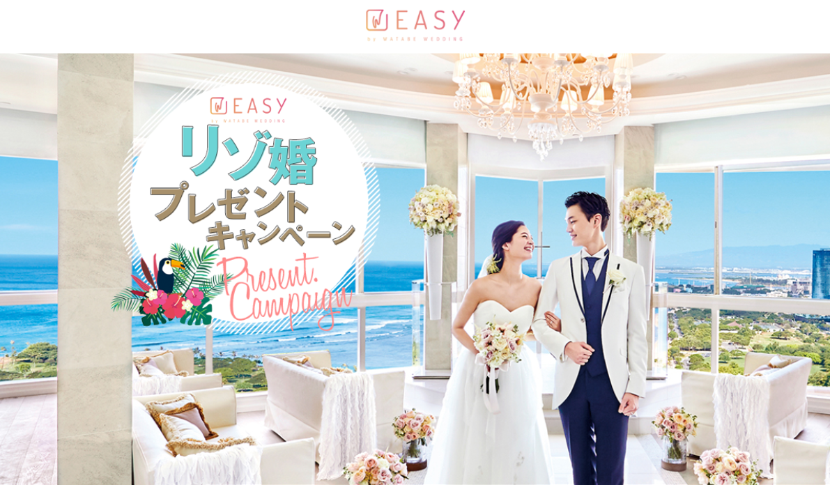 ワタベウェディング株式会社【本社:京都府京都市、資本金41億7,637万2,000円、東証第一部上場、代表取締役 花房伸晃】は、ECサイト「EASY by WATABE WEDDING」(https://www.watabe-wedding.co.jp/easy/)の2018年12月1日(土)リニューアルオープンを記念し、「EASYリゾ婚プレゼントキャンペーン」を2018年12月20日(木)~2019年1月31日(木)まで実施いたします。