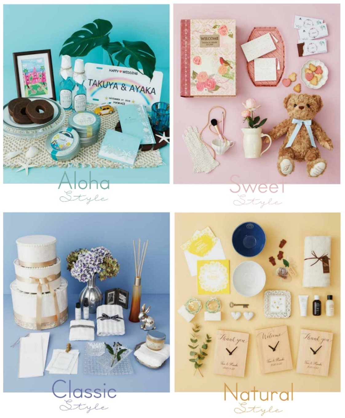 さらに、当ギフトブックでは、掲載しているアイテムの中からリゾ婚をイメージしてセレクトしたギフトコレクション「Aloha Style(アロハスタイル)」「Sweet Style(スウィートスタイル)」「Classic Style(クラシックスタイル)」「Natural Style(ナチュラルスタイル)」4スタイルを提案いたします。ご希望のスタイルを選ぶだけでペーパーアイテムから内祝いまで、おふたりのこだわりや自身のウェディングのテーマに合わせた、トータルコーディネートが叶います。