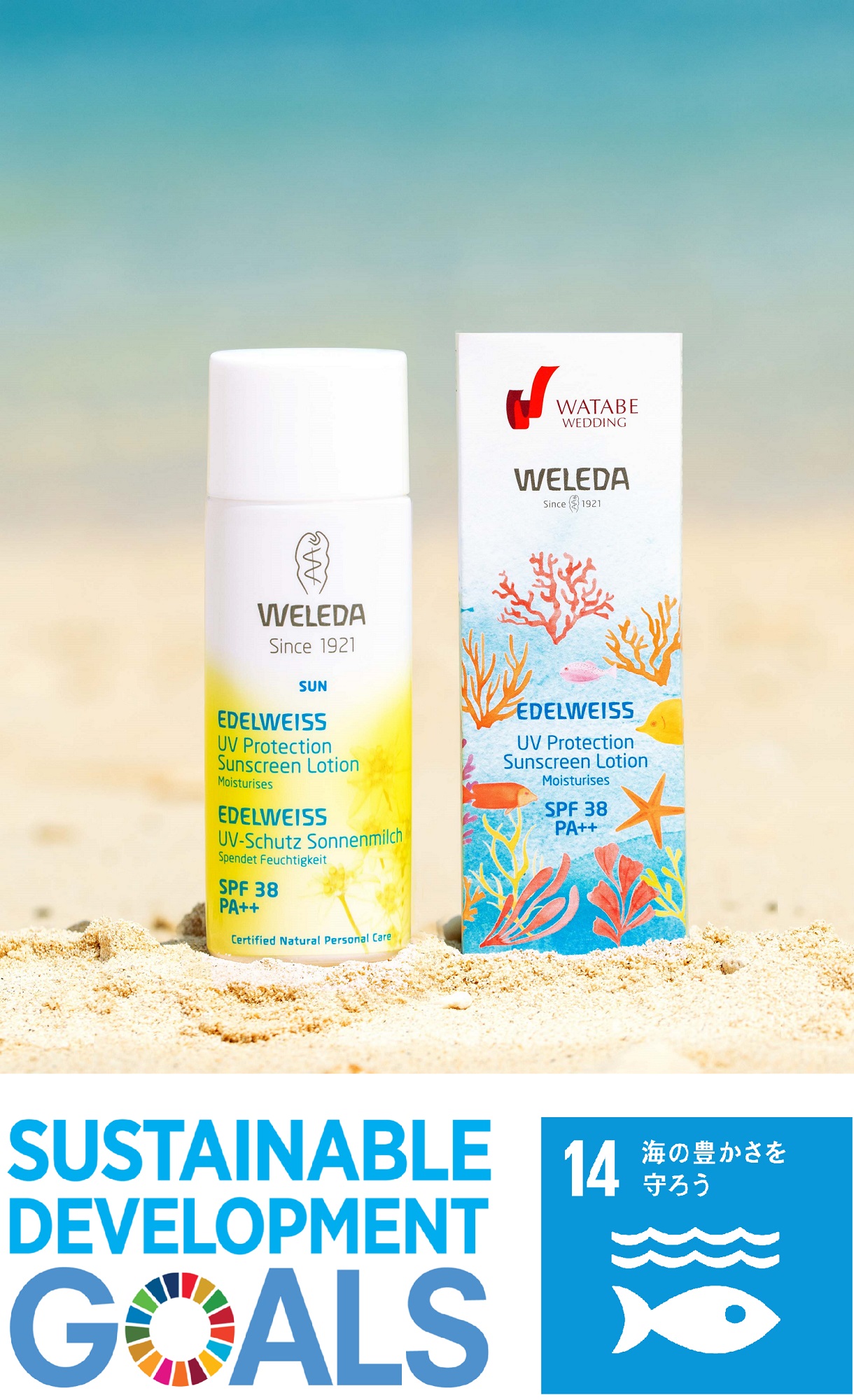 ワタベウェディング株式会社【本社:京都府京都市、資本金41億7,637万2,000円、東証第一部上場、代表取締役 花房伸晃】と、株式会社ヴェレダ・ジャパン【本社:東京都渋谷区、代表取締役 萩原吉晃】は、“持続可能を目的とした環境への取り組み”の一環として、サンゴ礁への有害成分を一切含まない日本限定処方のオーガニック日焼け止めクリーム「エーデルワイスUVプロテクト50mL」のコラボレーション限定パッケージを制作し、2019年7月1日(月)~2019年8月31日(土)まで、新規挙式相談で全国のワタベウェディング店舗に来店されたお客様にプレゼントする特別キャンペーンを実施いたします。また、本商品は、2019年7月1日(月)より、ヴェレダ・ジャパンの公式オンラインショップでも個数限定で販売いたします。