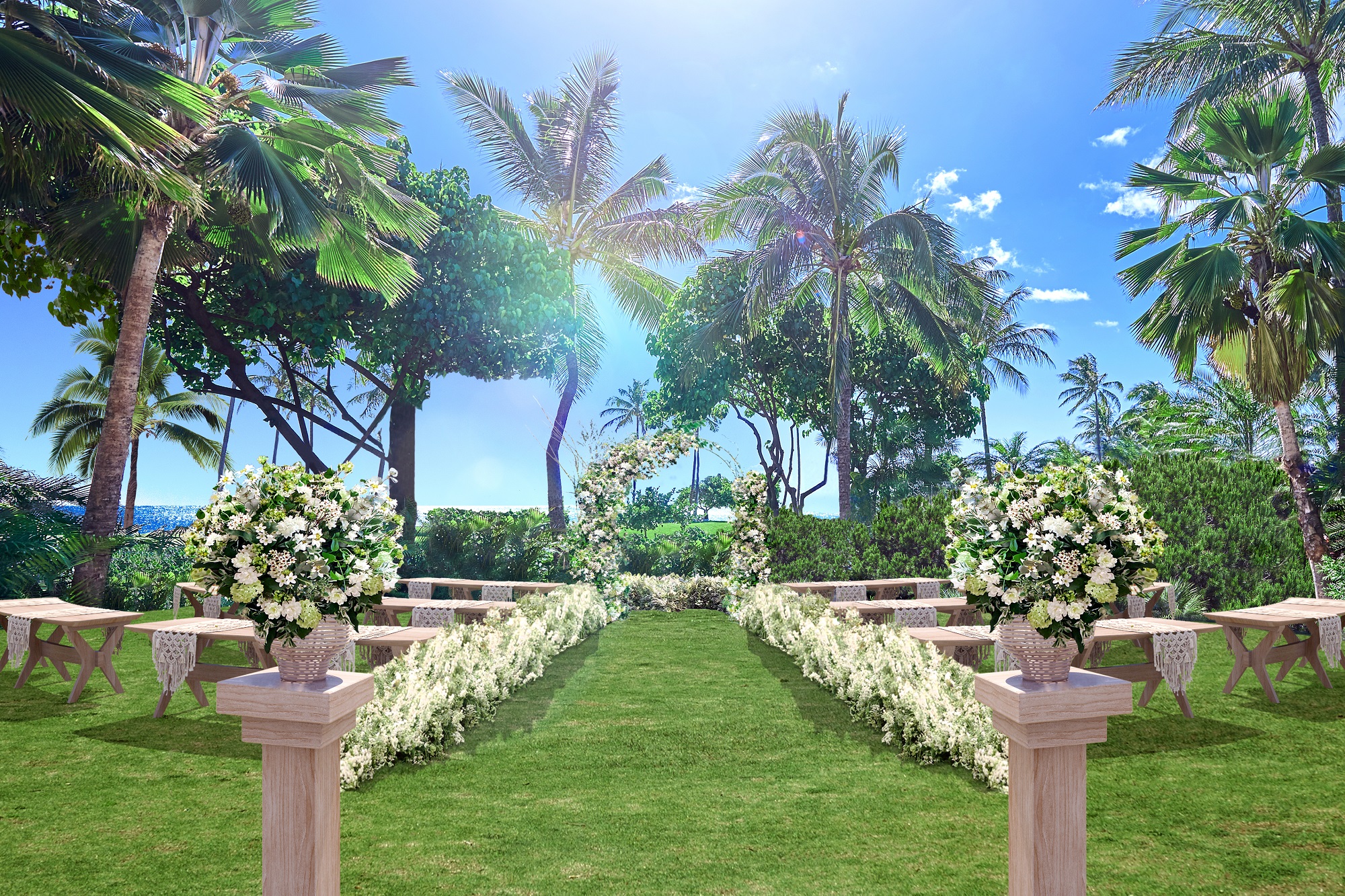 「コオリナ アクア・マリーナ」は、2020年2月1日(土)にリニューアルし、“チャペルウェディング”と“ガーデンウェディング”2つのスタイルを提案します。「コオリナ アクア・マリーナ」がある「コオリナ地区」は、かつてハワイ王朝に愛された高級リゾート地です。ワイキキの喧騒から離れ、穏やかでゆったりとした時間を過ごすことができ、高い晴天率を誇るハワイ屈指の美しい景観を満喫できる魅力的なエリアです。“ガーデンウェディング”は、一面に広がる青空と芝生のグリーンのコントラストが美しい、開放感のある挙式会場として新たに登場します。自然に溶け込むような装飾とウッド調のチェアを取入れるなど、コオリナの自然を活かし、ナチュラルでアットホームなコーディネートとなっています。ハワイのそよ風と光を感じながら、リラックスした雰囲気の中でウェディングを楽しむことができます。