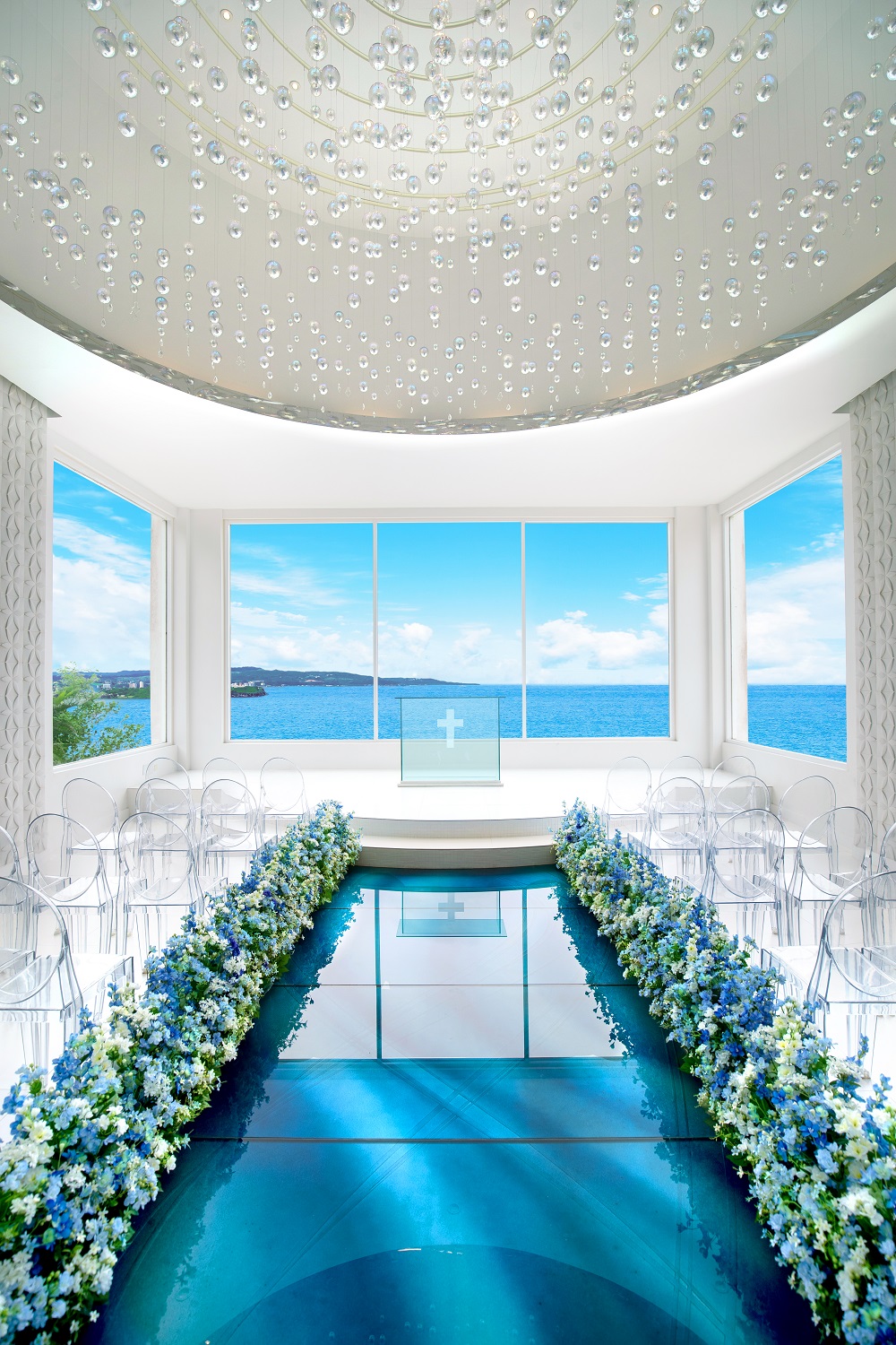 「オーシャンクリフ チャペル」は、標高約123mの高台に位置し、グアムでも特に美しい景観を誇る名所である「恋人岬」に佇む白亜のチャペルです。白と青のコントラストが美しい内観で、天井に施されたオーナメントは大きな窓から降り注ぐ陽光で輝き、青いバージンロードの先の祭壇からは、雄大なタモン湾の大海原が広がります。絶景を望める喧騒から離れたプライベートな空間の中、おふたりの未来を誓うセレモニーが行えます。挙式後は、チャペルに隣接する緑豊かなプライベートガーデンや、チャペル専用展望台からのダイナミックな景観の中で、フォトジェニックな写真撮影が可能です。