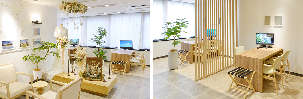 「ワタベウェディング 名古屋栄サロン」は、国内・海外のリゾートウェディングのご紹介を専門で行っています。この度、交通利便性が高く、お客様が多く訪れる名古屋栄エリアのさらなるお客様満足度の向上を目指し、「EURO NATURAL MODERN」をコンセプトに、洗練されたデザインでありながらナチュラルで落ち着ける空間にリニューアルいたします。店内は、一歩踏み入れた瞬間からリゾートを感じられるよう、明るい白を基調とした空間に、彩りを添える観葉植物やナチュラルな木のぬくもりを取り入れたデザインとなっています。さらに、高まるリゾートウェディングのニーズに対応し、相談カウンターのブース数を、十分なゆとりを確保しつつ4ブースから5ブースへと増設いたします。