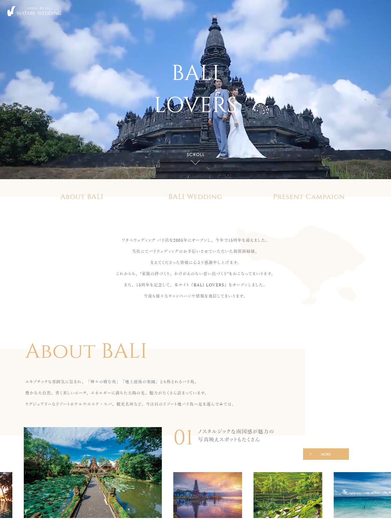 この度、バリ島進出15周年を記念して、15名様にバリ島ギフトが当たるキャンペーンを実施します。詳細は同日オープンする、バリ島専門特設サイト「BALI LOVERS」(https://www.watabe-wedding.co.jp/company/press/balilovers)内キャンペーンページにてご確認いただけます。「BALI LOVERS」では、バリ島の魅力をより知っていただくべく、バリの基本情報、観光情報、ウェディング会場などを紹介しています。