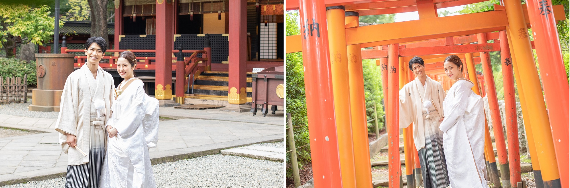 今回、新たなロケーションフォトのロケ地として追加される「根津神社」は、日本武尊(ヤマトタケル)が1900年近く前に創祀したと伝えられる古社です。7,000坪もの広く緑豊かな境内や美しい千本鳥居、国の重要文化財に指定されている楼門や社殿を背景に、荘厳な神域でのウェディングフォトを撮影いただけます。東京都内の神社での撮影が可能なフォトプランの取り扱いは、当社では今回が初となります。