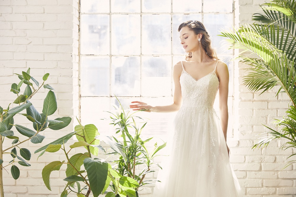 新しい人生を歩んでいくお2人をお祝いしたいという、“太陽の光が差す1日”という意味のことわざから誕生しました。ナチュラルな印象のドレスに、取り外し可能なオーガンジーのオーバースカートを付けることで、華やかな装いに。同様に取り外し可能なオフショルダーはシーンに合わせてお使いいただけます。