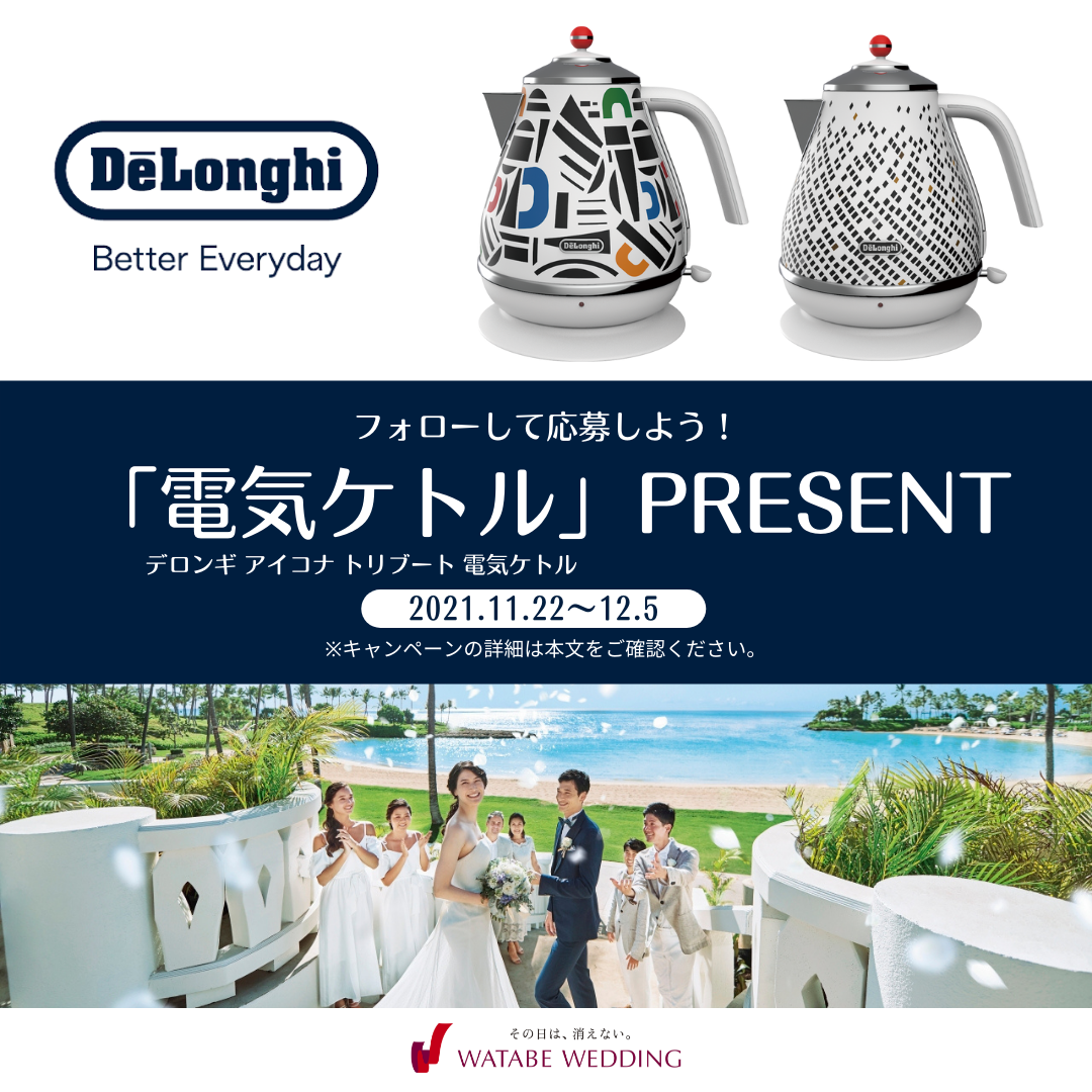 キャンペーン期間中にワタベウェディング及びデロンギの公式インスタグラムをフォローし、応募フォームより基本情報等をご入力の他、「ふうふの幸せなおうち時間に欲しい家電は?」という質問にお答えいただいた方の中から抽選で1名様にデロンギのキッチン家電「デロンギ アイコナ トリブート 電気ケトル(ヴィゴーレまたはセレニタ)」をプレゼントいたします。当商品は、デロンギのロングセラー商品「アイコナ」シリーズに、イタリアと日本の文化、その美しく豊かなデザインを融合させました。さらに、電気ケトルがはずれた方々にも、抽選で特別プレゼントをご用意しております。