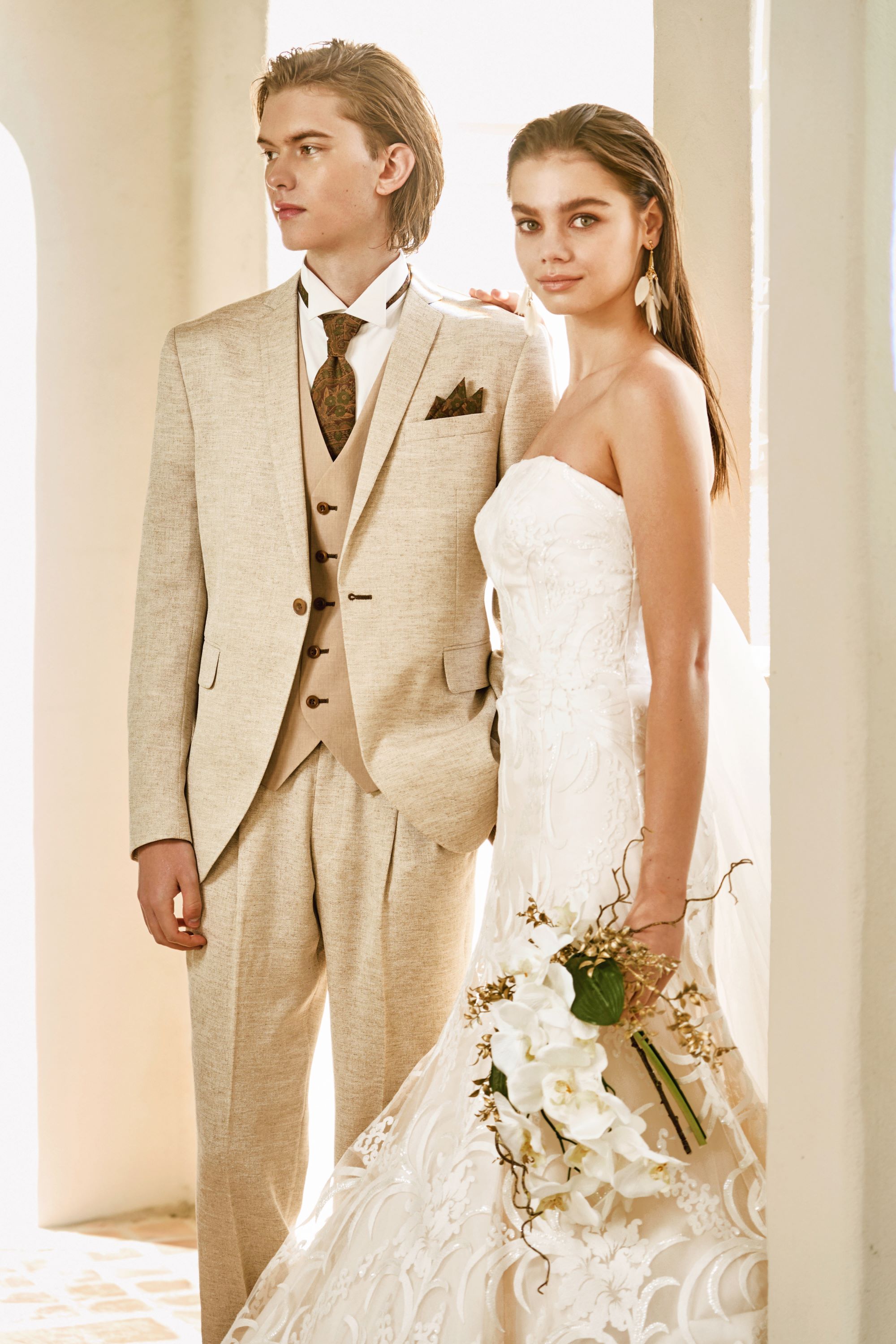 また、新作タキシードは2デザインが登場します。「Resoll Noir ASHER(アシェル)」は、サンドベージュカラーのリネン風生地で、カジュアルかつエフォートレスな雰囲気の1着です。ベージュとグリーンのリバーシブルベストに、ペイズリー柄ナロータイを組み合わせることで遊び心のあるファッショナブルなスタイリングになります。「Resoll Noir CIEL(シエル)」は、リゾートの空や海を感じさせるニュアンスブルーのタキシードで、ホワイトのボタンはタキシード全体にアクセントを加えます。ブルーとホワイトのリバーシブルベストは、ドッレシーな印象と抜け感のある涼しげな雰囲気を兼ね備えています。