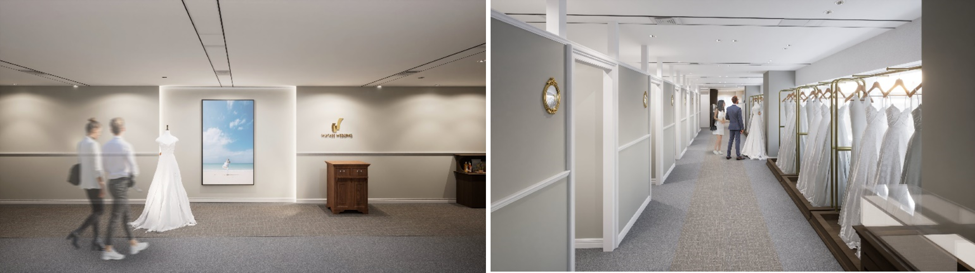 「ワタベウェディング 横浜グランドプラザ」は、国内・海外のリゾートウェディングを中心に、式場及びウェディングプランのご紹介や、ご成約後の衣裳・旅行・挙式オプションのご提案を行うウェディングサロンです。この度、JR横浜駅の西口より徒歩5分、きた西口より徒歩3分の立地に移転いたします。店舗の内装は「Modern Traditional」をコンセプトに、リゾートホテルにいるような高級感と伝統を感じる洗練されたデザインにリニューアルいたしました。衣裳フロアは、より広々と快適にドレスやタキシード、コーディネート小物を選べる空間となり、挙式相談スペースには、お子様連れのお客様にも安心してお過ごしいただけるよう、プライベートルームを2部屋新設しました。
