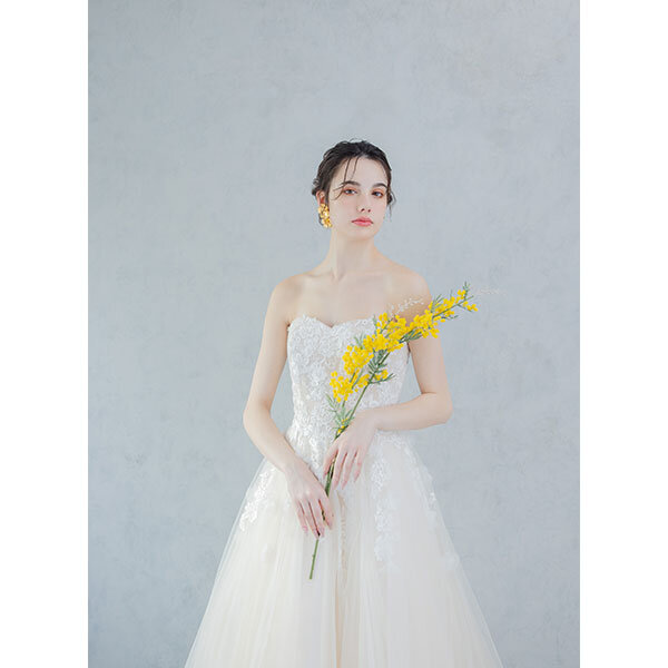 コルセットの形を取り入れた流行のインポート風デザインでありながら、ボディラインが美しく見えるシルエットにこだわったドレス。エレガントなレース生地の上に柔らかいチュールを重ねたスカートは、膝から下に立体的な花をちりばめることで、動きに合わせて舞うようなデザインとなっています。
