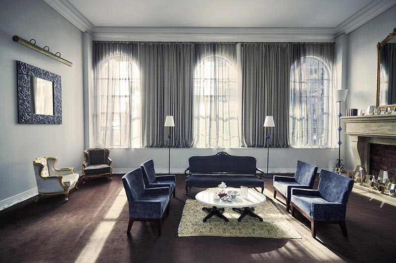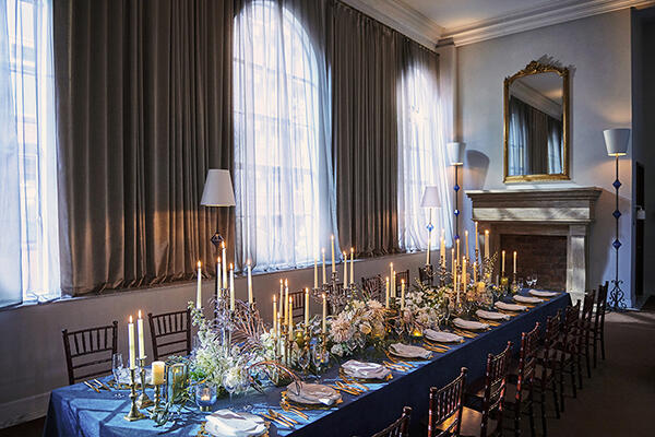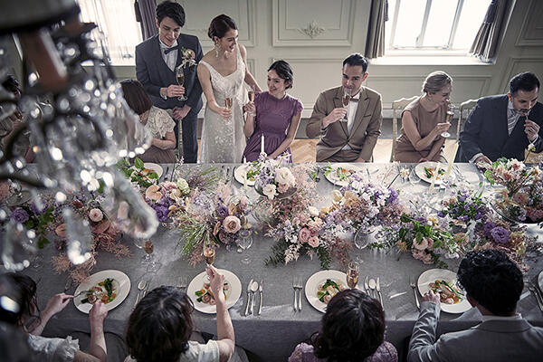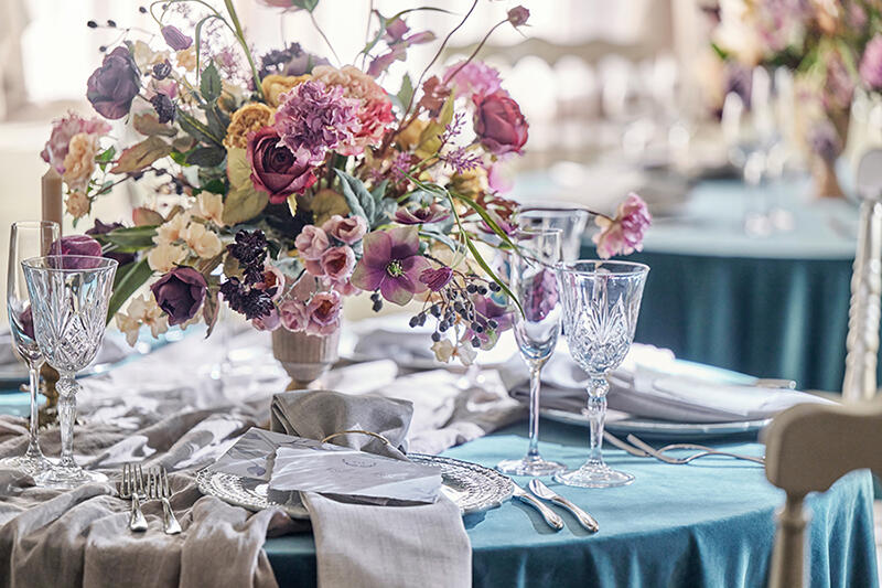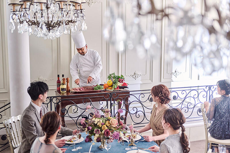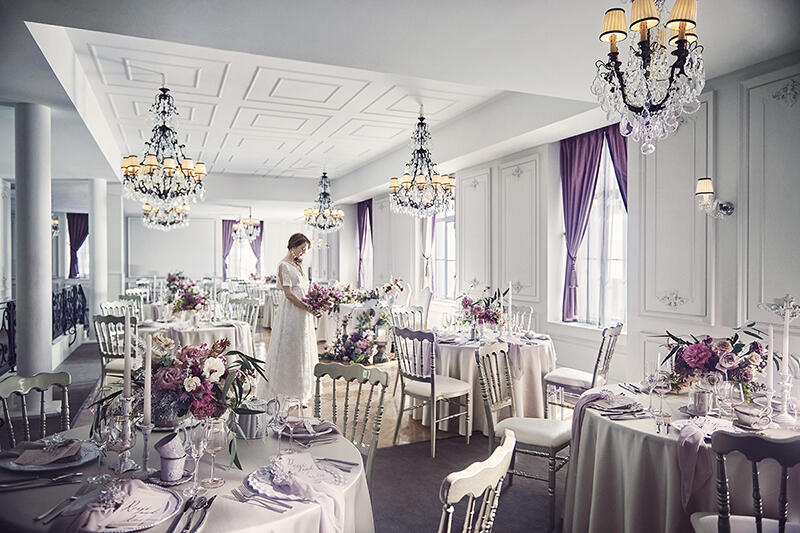 白を基調とした空間に、アンティークシャンデリアやクラシカルな装飾が映えるパーティ会場。 やわらかな自然光が差し込み、気品と温もりに包まれた大人のパーティを叶えます。