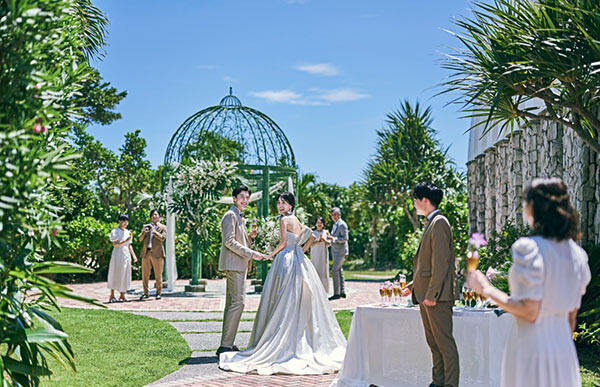 沖縄の眩しい太陽光をガーデンで感じながら、青空の下で結婚を誓います。