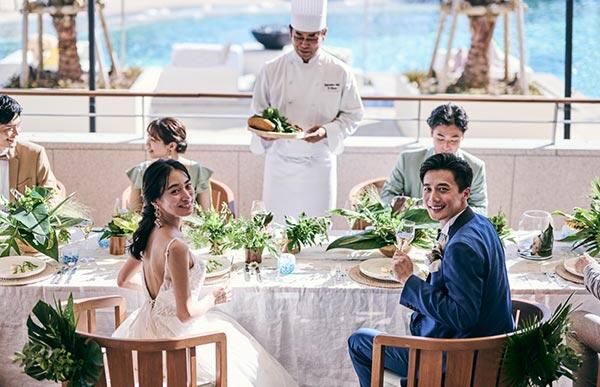 沖縄のガーデンウェディングでは、リゾートの非日常感を感じられる演出、ゲストとのつながりを感じられる演出、ガーデンならではの空間を使った演出が人気です。