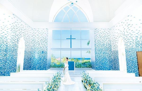 宮古島ウェディングを象徴するチャペル。圧巻のステンドグラスを背景に忘れられないセレモニーを
