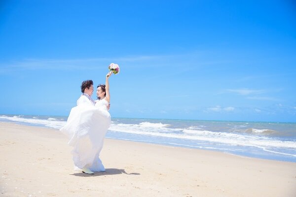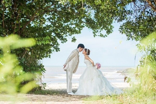 ケアンズは白い美しい砂浜が続くビーチが特徴です。美しく広がる青い空と綺麗な海、差し色として写りこむ緑のコントラストがより一層リゾートを感じさせてくれます。ケアンズならではのフォトウェディングを楽しめます。