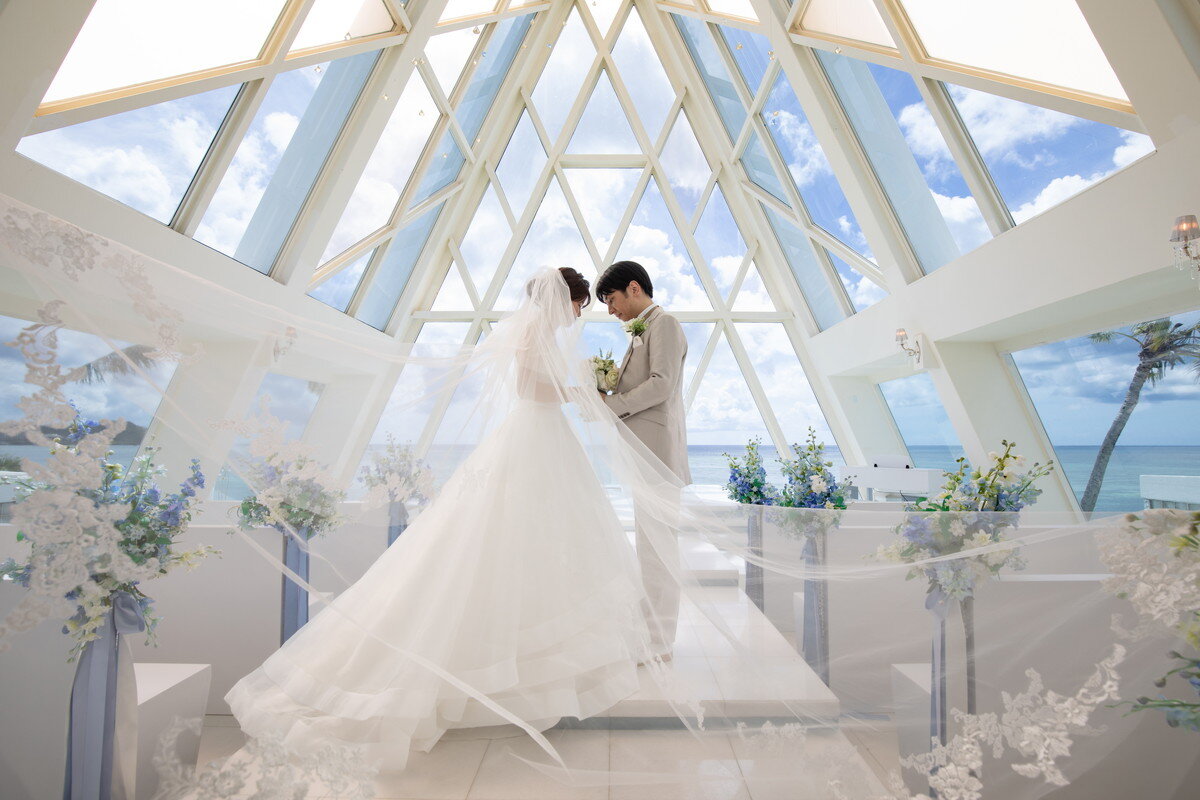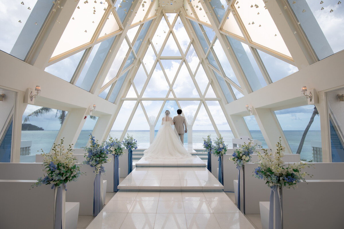 全方向ガラス張りのブルーアステールチャペル。訪れる人すべてを虜にするほどのロマンチックなチャペルは青い海と青い空が溶け合う空間に純白の大理石のバージンロードが輝きます。美しいチャペルでのフォーマル撮影とリゾートならではのビーチ撮影がおふたりの大切な一日をかけがえのない時間へと導きます