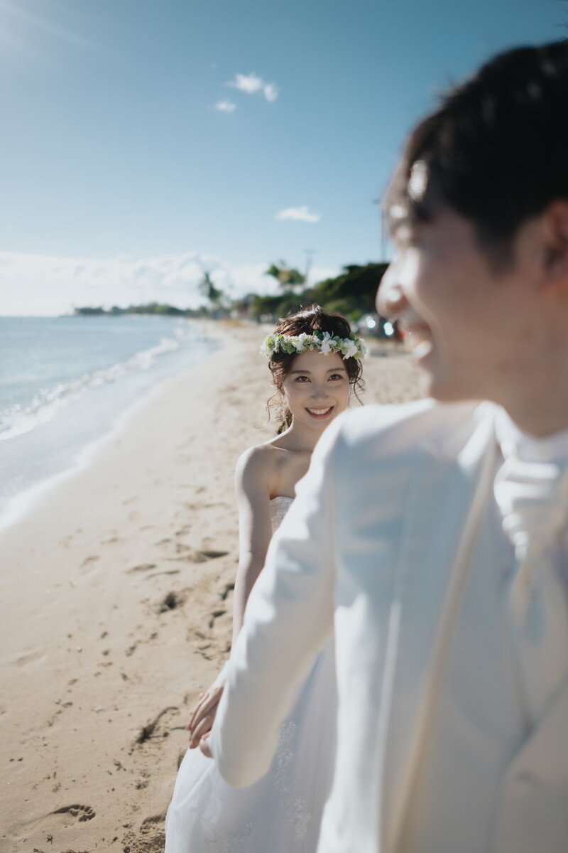 コオリナリゾートで落ち着いた雰囲気で撮影したあとは、ダイヤモンドヘッドを遠くに望みながら、どこまでも続く水平線と広々とした芝生が迎えてくれるアラモアナビーチ&パークでもっと笑顔に溢れた撮影を。洗練された都会のスカイラインを背景に、ラヴィファクトリーのプロフォトグラファーがさまざまな表情を残します。
