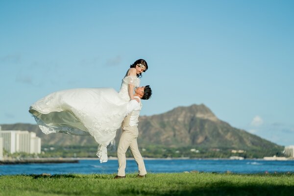 コオリナリゾートで落ち着いた雰囲気で撮影したあとは、ダイヤモンドヘッドを遠くに望みながら、どこまでも続く水平線と広々とした芝生が迎えてくれるアラモアナビーチ&パークでもっと笑顔に溢れた撮影を。洗練された都会のスカイラインを背景に、ラヴィファクトリーのプロフォトグラファーがさまざまな表情を残します。