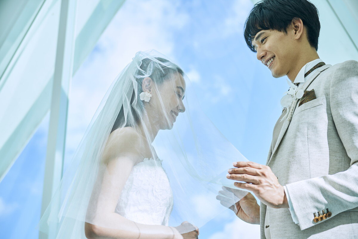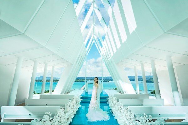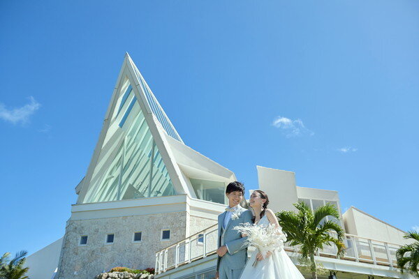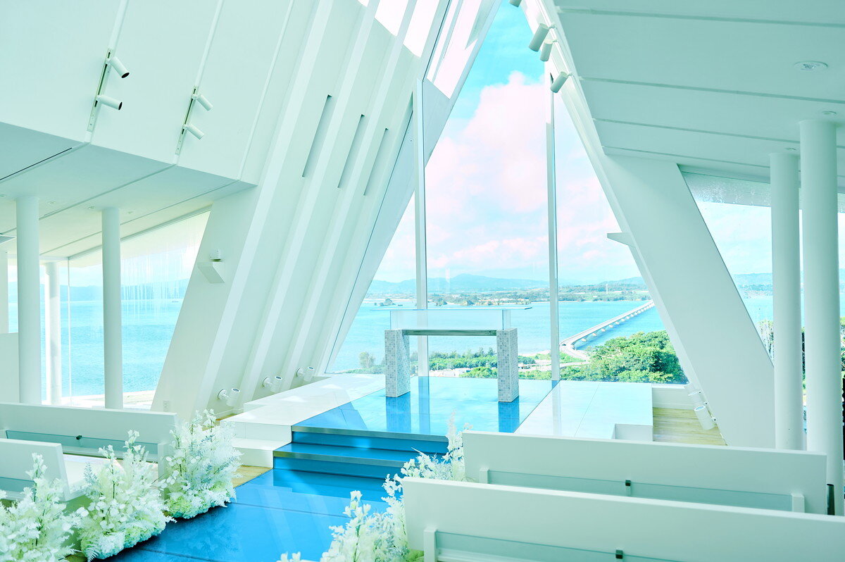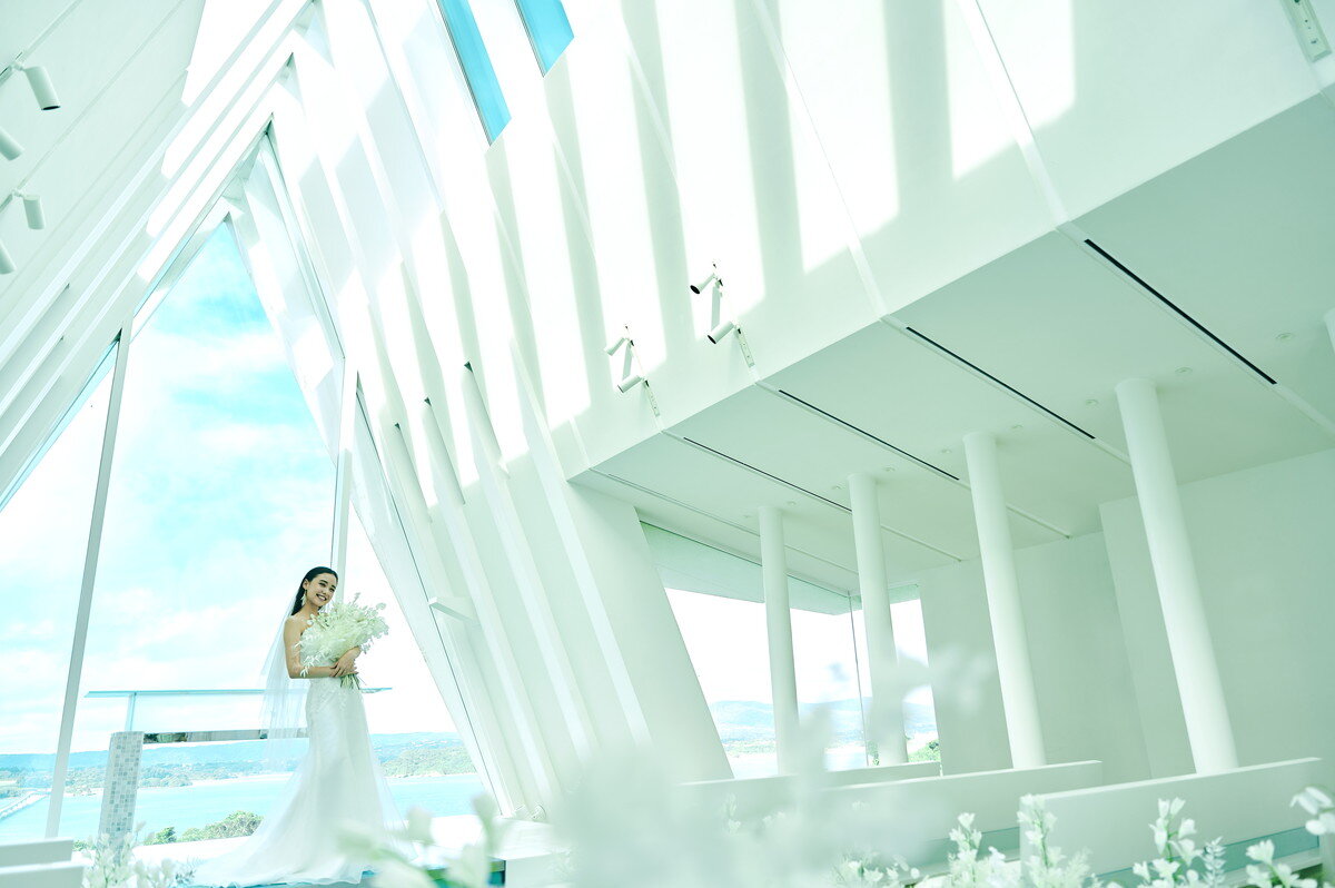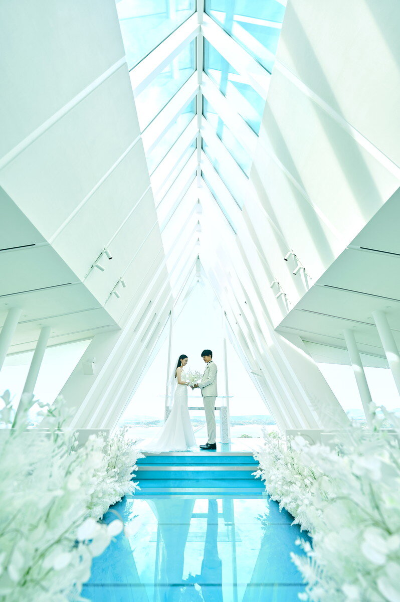 この地に宿る神々の力と壮大な自然、本物の蒼を映す白亜のチャペルが撮影の舞台。空と海のブルーにつながるように伸びるガラスのバージンロードに、絶景を前に誓う永遠の愛。特別な一日に描くシーンのすべてに、古宇利島の大自然が寄り添います。