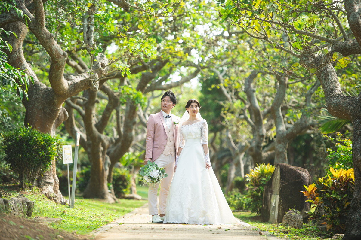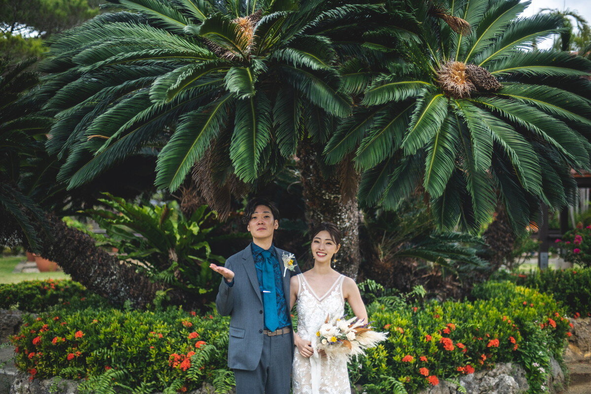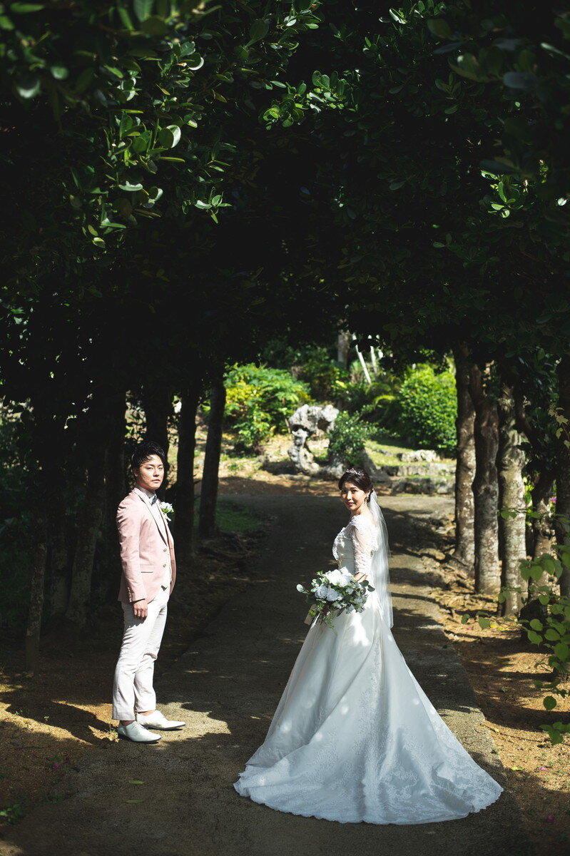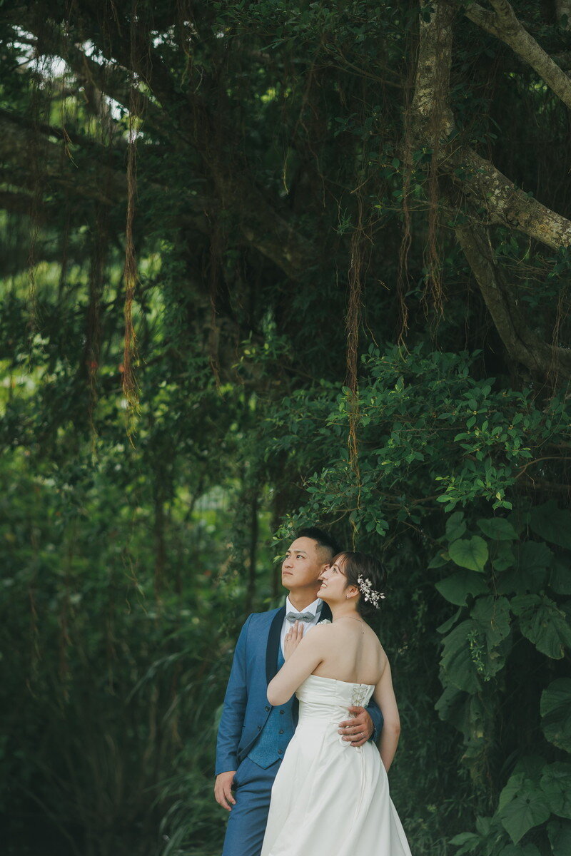 宮古島の静かな森に広がる 熱帯植物園。濃く鮮やかな緑、個性豊かな熱帯植物、木漏れ日が揺れる明るい散策路――。ここに流れるゆったりとした空気は、まるで自然に抱きしめられているよう。海とはまた違う、植物に満ちた豊かな表情が、ふたりのフォトウエディングに優しい彩りを添えます。