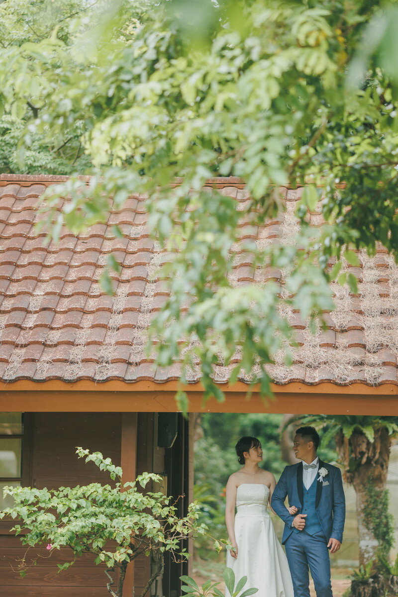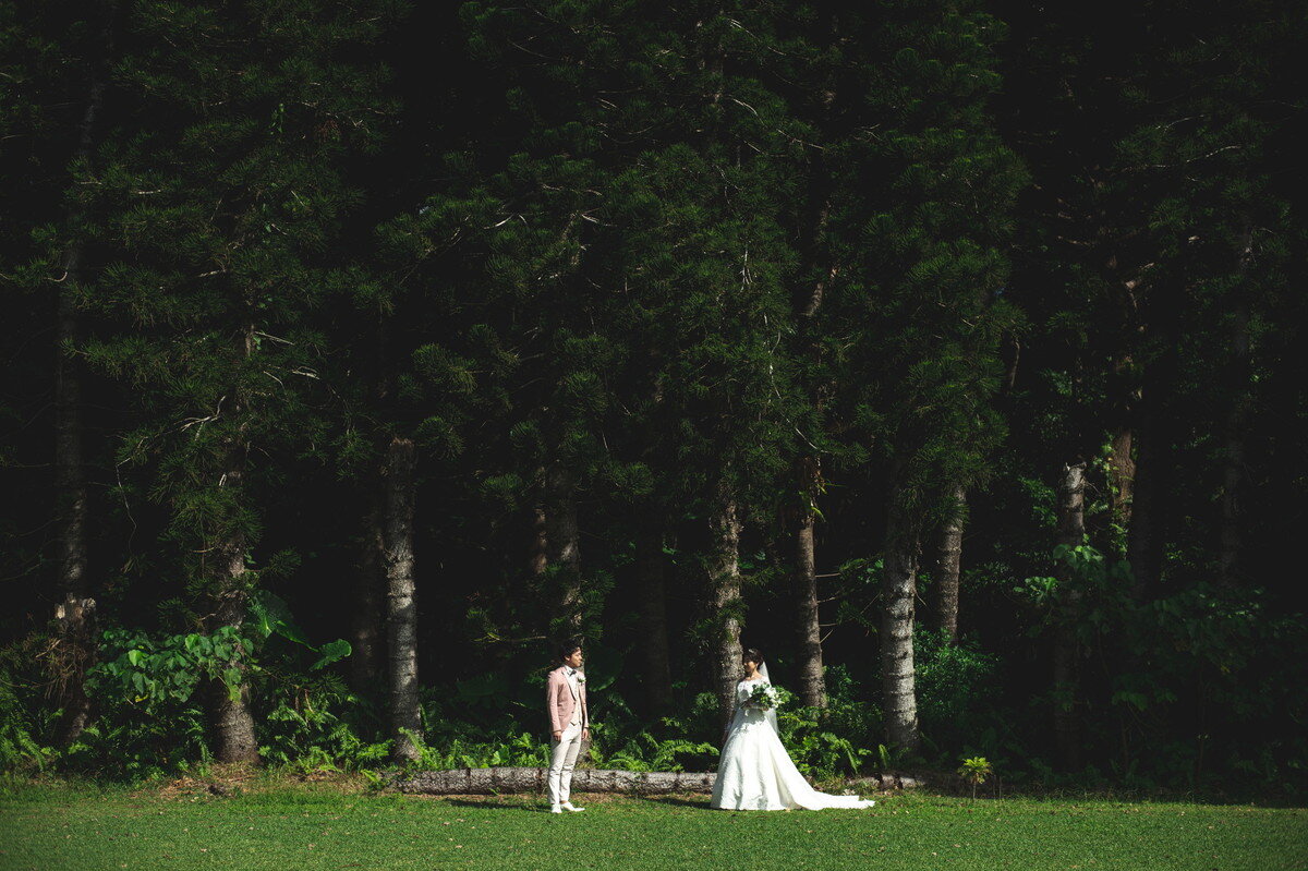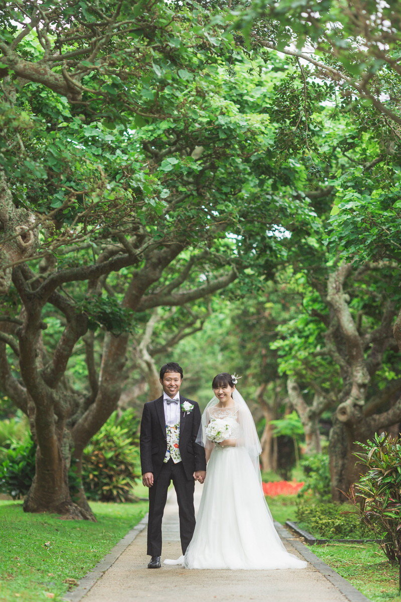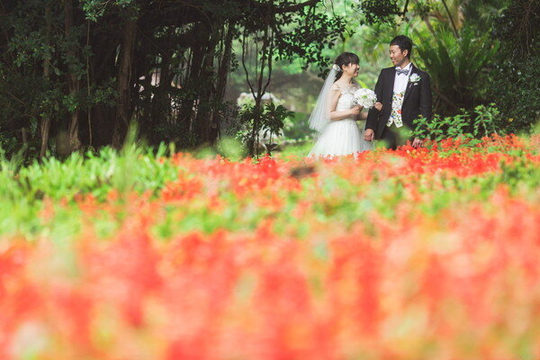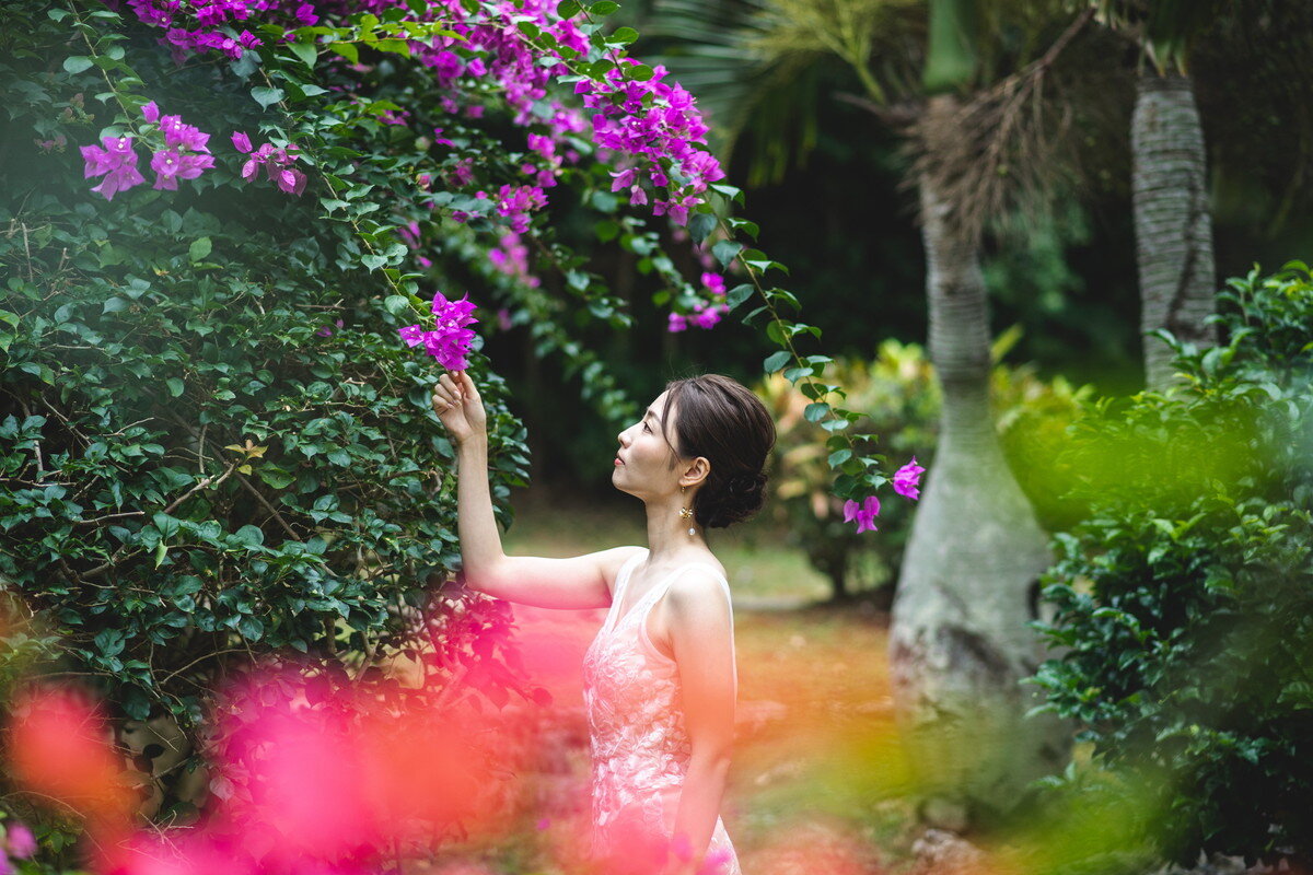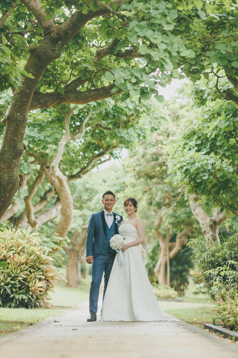 宮古島の静かな森に広がる 熱帯植物園。濃く鮮やかな緑、個性豊かな熱帯植物、木漏れ日が揺れる明るい散策路――。ここに流れるゆったりとした空気は、まるで自然に抱きしめられているよう。海とはまた違う、植物に満ちた豊かな表情が、ふたりのフォトウエディングに優しい彩りを添えます。