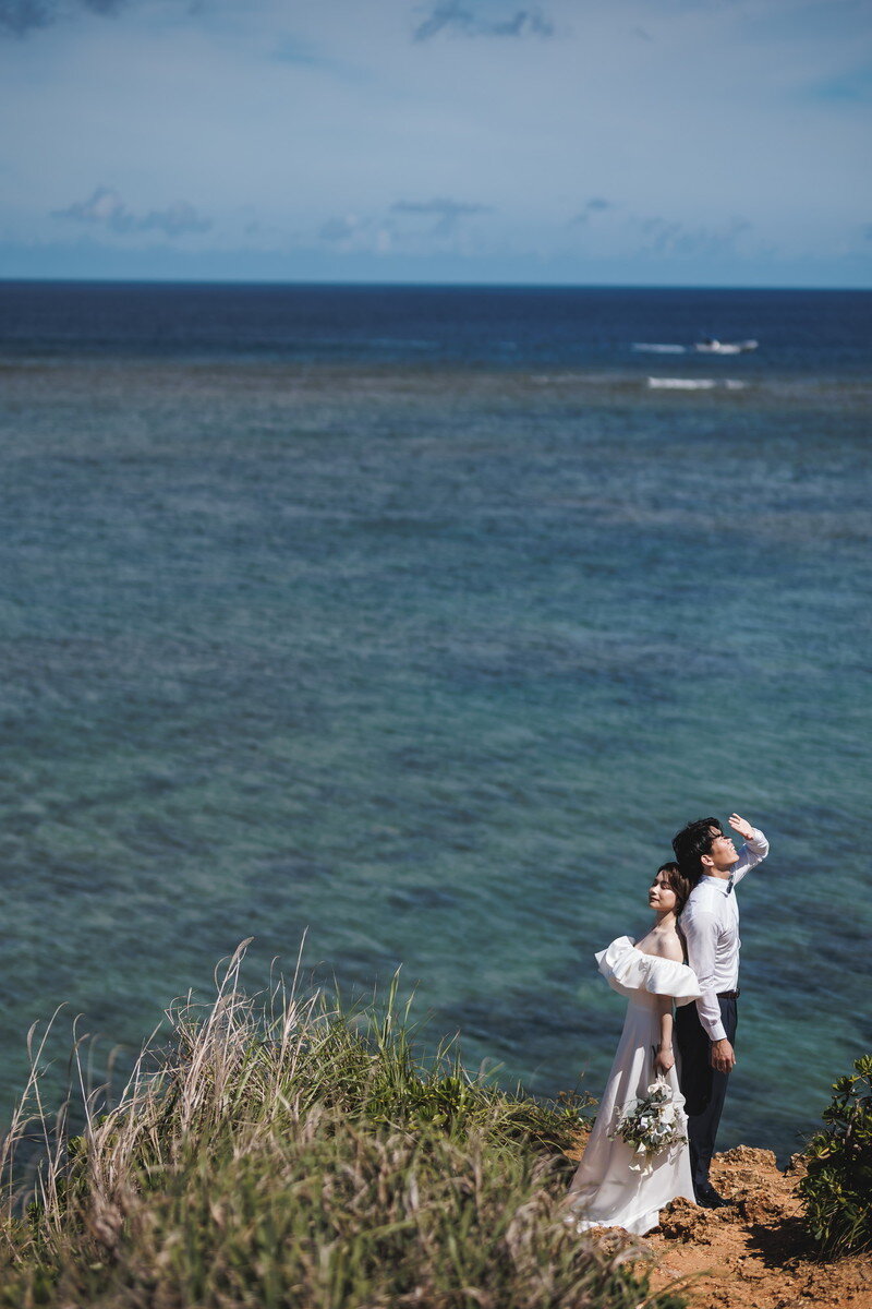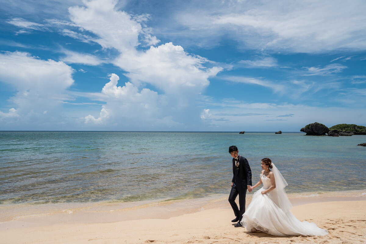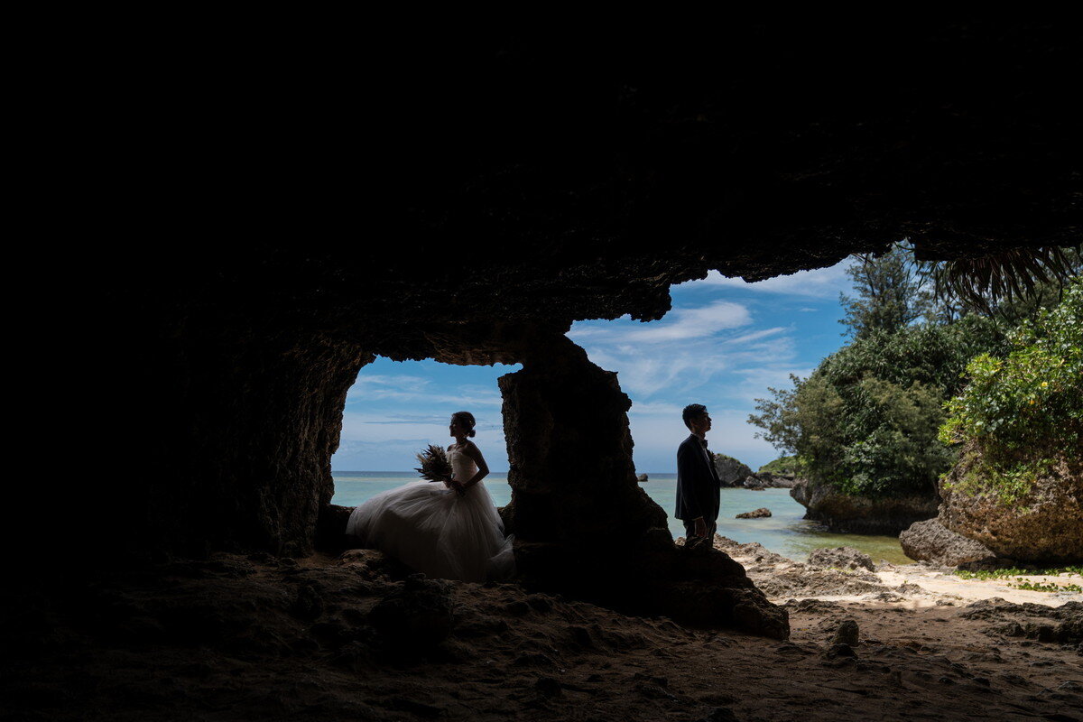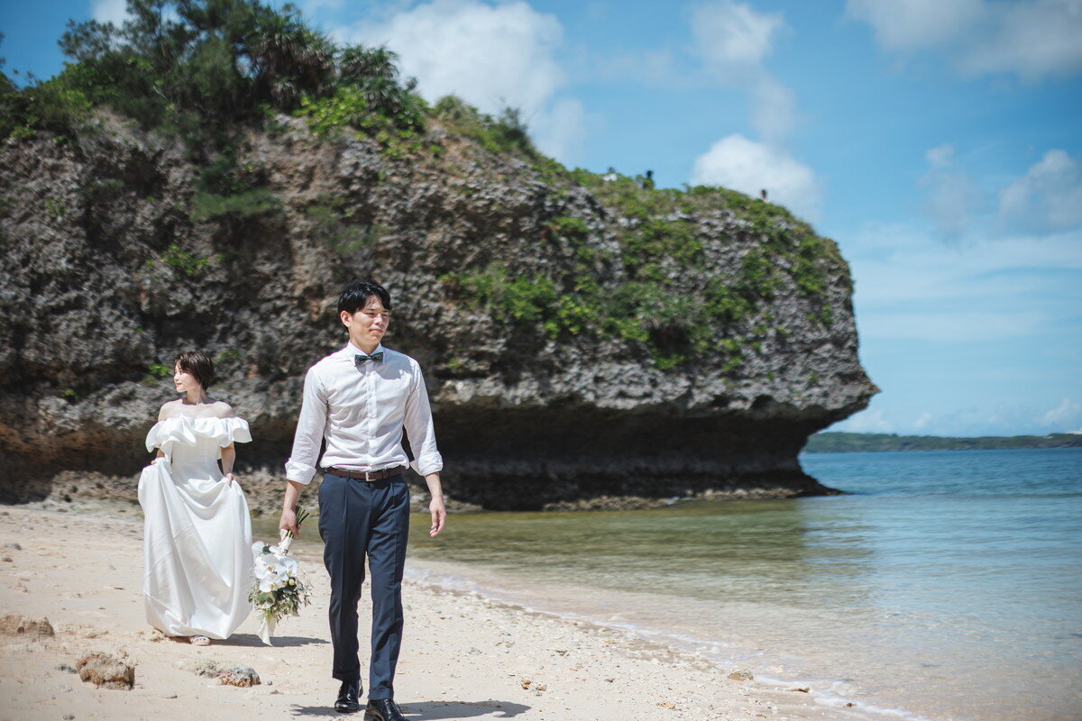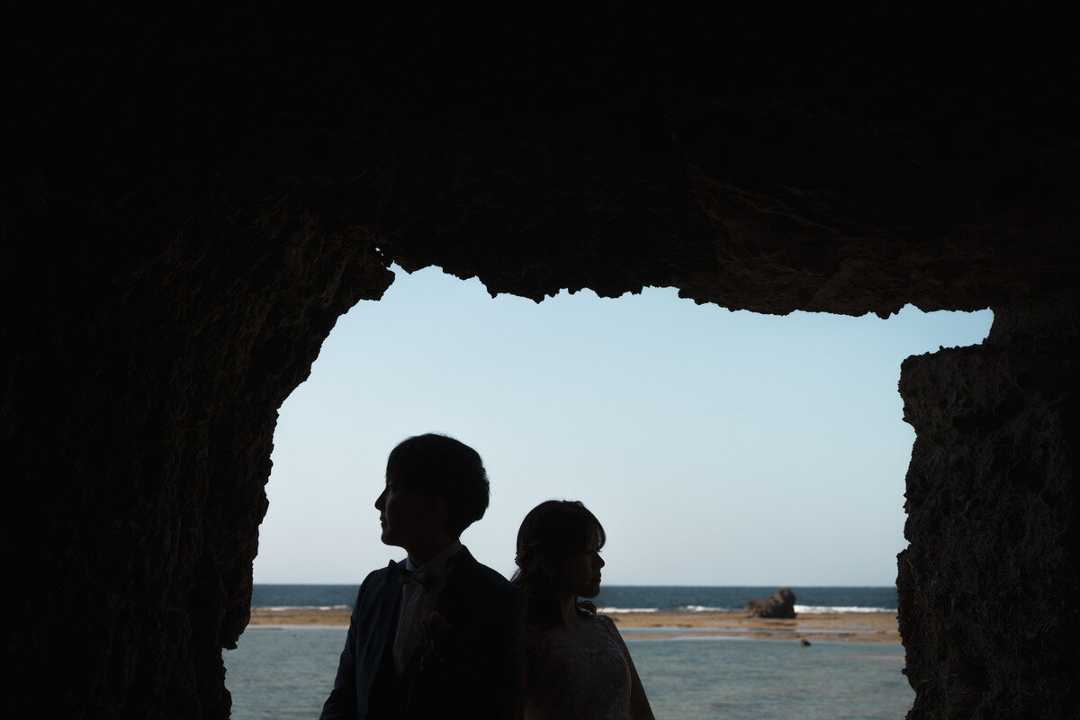 沖縄本島でも数少ない、手つかずの自然が美しく残る ザネー浜。優しい波音だけが響く静かな浜辺は、まるで時がゆっくりと流れるような場所。透明感のある海とダイナミックな岩壁、素朴で力強い自然が、ふたりの瞬間をより深く印象的に映し出します。